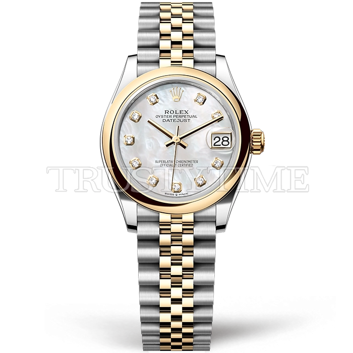 Часы Rolex из коллекции DateJust. Классические женские часы Rolex DateJust 31mm 278243-0028 премиального качества (Артикул магазина: RX-3240) оснащены надежным автоматическим механизмом с автоподзаводом (работает от амплитуды движения руки) калибра ETA2836-2, в котором реализованы следующие функции: часовая, минутная и секундная стрелки, а так же дата. Круглый корпус часов комбинированного сталь с желтого золота цвета, имеющий размер 31 мм и высоту 12 мм превосходно дополнит образ и украсит запястье своего обладателя. Для изготовления часов Rolex DateJust 31mm 278243-0028 предлагаемых в нашем интернет-магазине, применяются нержавеющая сталь 316F высокого качества (Швейцарский стандарт), а так же сапфировое стекло высокой прочности, благодаря чему обеспечивается максимальная защита от сколов и механических повреждений. Отличительной чертой данной модели является перламутровый циферблат, часовые индексы которого обеспечивают камни. Завершает образ браслет из нержавеющей стали комбинированного сталь с желтым золотом цвета с фирменной раскладывающейся застежкой Rolex. Водонепроницаемость данной модели составляет 30М (WR30) – допускается минимальное воздействие с водой.