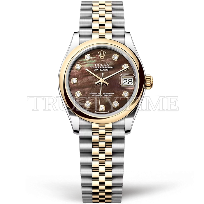 Часы Rolex из коллекции DateJust. Классические женские часы Rolex DateJust 31mm 278243-0024 премиального качества (Артикул магазина: RX-3246) оснащены надежным автоматическим механизмом с автоподзаводом (работает от амплитуды движения руки) калибра ETA2824-2, в котором реализованы следующие функции: часовая, минутная и секундная стрелки, а так же дата. Круглый корпус часов комбинированного сталь с желтого золота цвета, имеющий размер 31 мм и высоту 12 мм превосходно дополнит образ и украсит запястье своего обладателя. Для изготовления часов Rolex DateJust 31mm 278243-0024 предлагаемых в нашем интернет-магазине, применяются нержавеющая сталь 316F высокого качества (Швейцарский стандарт), а так же сапфировое стекло высокой прочности, благодаря чему обеспечивается максимальная защита от сколов и механических повреждений. Отличительной чертой данной модели является коричневый циферблат, часовые индексы которого обеспечивают камни. Завершает образ браслет из нержавеющей стали комбинированного сталь с желтым золотом цвета с фирменной раскладывающейся застежкой Rolex. Водонепроницаемость данной модели составляет 30М (WR30) – допускается минимальное воздействие с водой.