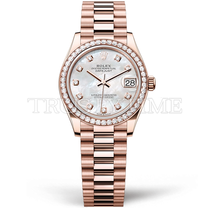 Часы Rolex из коллекции DateJust. Классические женские часы Rolex DateJust 31mm 278285RBR-0005 премиального качества (Артикул магазина: RX-3272) оснащены надежным автоматическим механизмом с автоподзаводом (работает от амплитуды движения руки) калибра ETA2824-2, в котором реализованы следующие функции: часовая, минутная и секундная стрелки, а так же дата. Круглый корпус часов розового цвета, имеющий размер 31 мм и высоту 12 мм превосходно дополнит образ и украсит запястье своего обладателя. Для изготовления часов Rolex DateJust 31mm 278285RBR-0005 предлагаемых в нашем интернет-магазине, применяются нержавеющая сталь 316F высокого качества (Швейцарский стандарт), а так же сапфировое стекло высокой прочности, благодаря чему обеспечивается максимальная защита от сколов и механических повреждений. Отличительной чертой данной модели является перламутровый циферблат, часовые индексы которого обеспечивают камни. Завершает образ браслет из нержавеющей стали цвета розового золота с фирменной раскладывающейся застежкой Rolex. Водонепроницаемость данной модели составляет 30М (WR30) – допускается минимальное воздействие с водой.