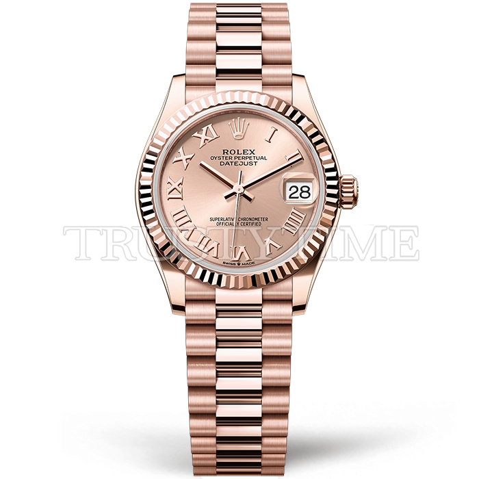 Часы Rolex из коллекции DateJust. Классические женские часы Rolex DateJust 31mm 278275-0035 премиального качества (Артикул магазина: RX-3275) оснащены надежным автоматическим механизмом с автоподзаводом (работает от амплитуды движения руки) калибра ETA2824-2, в котором реализованы следующие функции: часовая, минутная и секундная стрелки, а так же дата. Круглый корпус часов розового цвета, имеющий размер 31 мм и высоту 12 мм превосходно дополнит образ и украсит запястье своего обладателя. Для изготовления часов Rolex DateJust 31mm 278275-0035 предлагаемых в нашем интернет-магазине, применяются нержавеющая сталь 316F высокого качества (Швейцарский стандарт), а так же сапфировое стекло высокой прочности, благодаря чему обеспечивается максимальная защита от сколов и механических повреждений. Отличительной чертой данной модели является розовый циферблат, часовые индексы которого обеспечивают римские цифры. Завершает образ браслет из нержавеющей стали цвета розового золота с фирменной раскладывающейся застежкой Rolex. Водонепроницаемость данной модели составляет 30М (WR30) – допускается минимальное воздействие с водой.