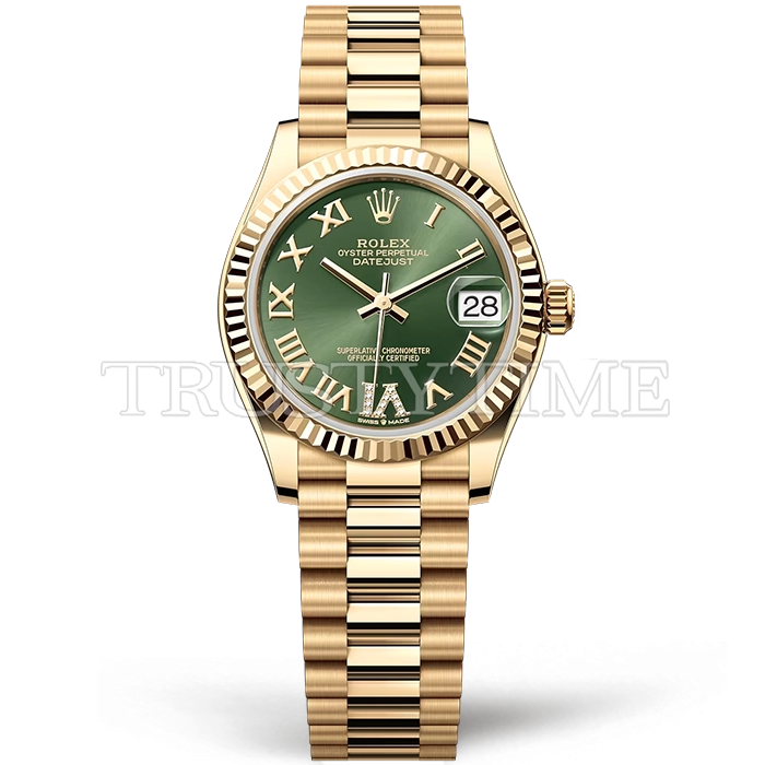 Часы Rolex из коллекции DateJust. Классические женские часы Rolex DateJust 31mm 278278-0030 премиального качества (Артикул магазина: RX-3293) оснащены надежным автоматическим механизмом с автоподзаводом (работает от амплитуды движения руки) калибра ETA2824-2, в котором реализованы следующие функции: часовая, минутная и секундная стрелки, а так же дата. Круглый корпус часов цветы желтой золота, имеющий размер 31 мм и высоту 12 мм превосходно дополнит образ и украсит запястье своего обладателя. Для изготовления часов Rolex DateJust 31mm 278278-0030 предлагаемых в нашем интернет-магазине, применяются нержавеющая сталь 316F высокого качества (Швейцарский стандарт), а так же сапфировое стекло высокой прочности, благодаря чему обеспечивается максимальная защита от сколов и механических повреждений. Отличительной чертой данной модели является зеленый циферблат, часовые индексы которого обеспечивают римские цифры. Завершает образ браслет из нержавеющей стали цвета желтого золота с фирменной раскладывающейся застежкой Rolex. Водонепроницаемость данной модели составляет 30М (WR30) – допускается минимальное воздействие с водой.