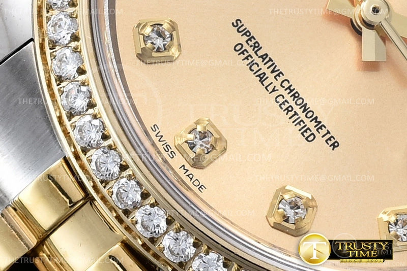 Часы Rolex из коллекции DateJust. Классические женские часы Rolex DateJust 36mm 116243-0005 премиального качества (Артикул магазина: RX-0531) оснащены надежным автоматическим механизмом с автоподзаводом (работает от амплитуды движения руки) калибра 3135, в котором реализованы следующие функции: часовая, минутная и секундная стрелки, а так же дата. Круглый корпус часов комбинированного сталь с желтого золота цвета, имеющий размер 36 мм и высоту 12.5 мм превосходно дополнит образ и украсит запястье своего обладателя. Для изготовления часов Rolex DateJust 36mm 116243-0005 предлагаемых в нашем интернет-магазине, применяются нержавеющая сталь 316L высокого качества (Швейцарский стандарт), а так же сапфировое стекло высокой прочности, благодаря чему обеспечивается максимальная защита от сколов и механических повреждений. Отличительной чертой данной модели является золотой циферблат, часовые индексы которого обеспечивают камни. Завершает образ браслет из нержавеющей стали комбинированного сталь с желтым золотом цвета с фирменной раскладывающейся застежкой Rolex. Водонепроницаемость данной модели составляет 30М (WR30) – допускается минимальное воздействие с водой.