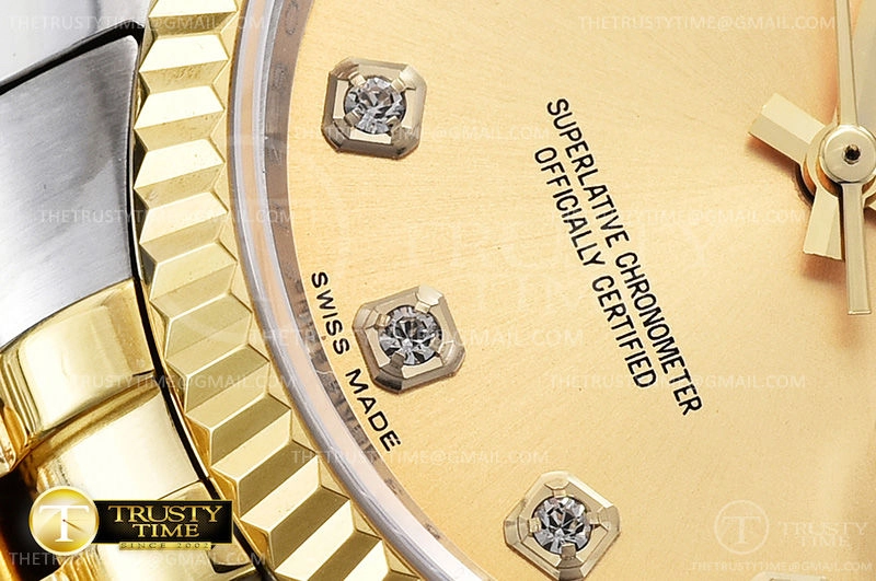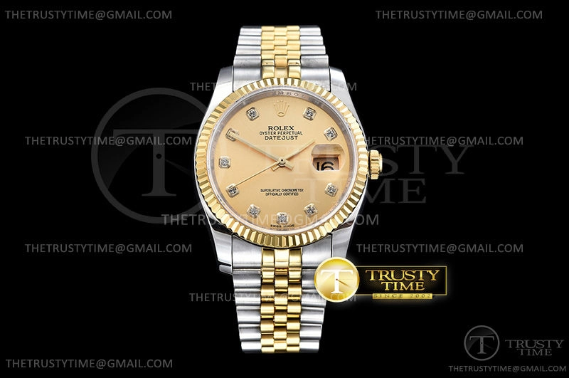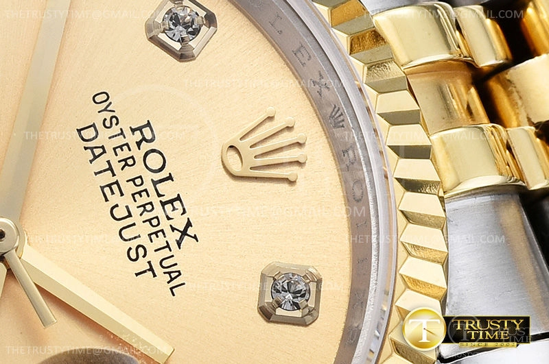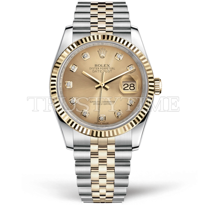 Часы Rolex из коллекции DateJust. Классические женские часы Rolex DateJust 36mm 116233-0150 премиального качества (Артикул магазина: RX-0514) оснащены надежным автоматическим механизмом с автоподзаводом (работает от амплитуды движения руки) калибра 3135, в котором реализованы следующие функции: часовая, минутная и секундная стрелки, а так же дата. Круглый корпус часов комбинированного сталь с желтого золота цвета, имеющий размер 36 мм и высоту 12 мм превосходно дополнит образ и украсит запястье своего обладателя. Для изготовления часов Rolex DateJust 36mm 116233-0150 предлагаемых в нашем интернет-магазине, применяются нержавеющая сталь 316F высокого качества (Швейцарский стандарт), а так же сапфировое стекло высокой прочности, благодаря чему обеспечивается максимальная защита от сколов и механических повреждений. Отличительной чертой данной модели является золотой циферблат, часовые индексы которого обеспечивают камни. Завершает образ браслет из нержавеющей стали комбинированного сталь с желтым золотом цвета с фирменной раскладывающейся застежкой Rolex. Водонепроницаемость данной модели составляет 30М (WR30) – допускается минимальное воздействие с водой.