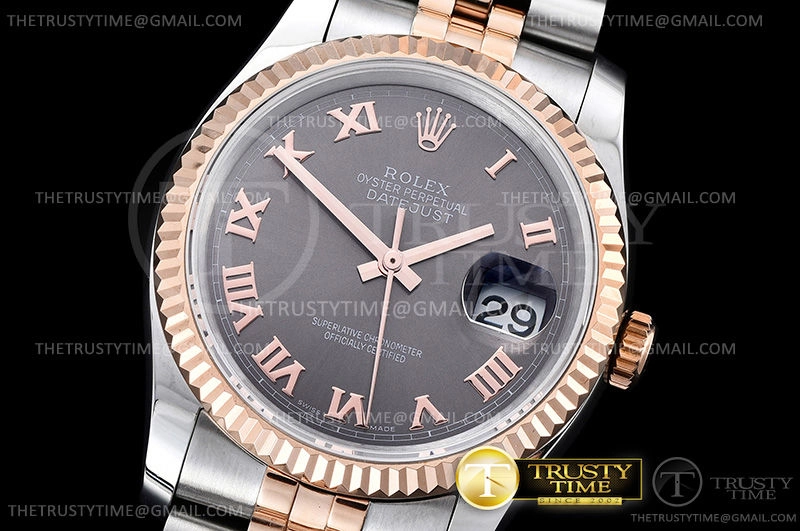 Часы Rolex из коллекции DateJust. Классические женские часы Rolex DateJust 36mm 116231-0087 премиального качества (Артикул магазина: RX-0504) оснащены надежным автоматическим механизмом с автоподзаводом (работает от амплитуды движения руки) калибра 3135, в котором реализованы следующие функции: часовая, минутная и секундная стрелки, а так же дата. Круглый корпус часов комбинированного сталь с розового золота цвета, имеющий размер 36 мм и высоту 12 мм превосходно дополнит образ и украсит запястье своего обладателя. Для изготовления часов Rolex DateJust 36mm 116231-0087 предлагаемых в нашем интернет-магазине, применяются нержавеющая сталь 316F высокого качества (Швейцарский стандарт), а так же сапфировое стекло высокой прочности, благодаря чему обеспечивается максимальная защита от сколов и механических повреждений. Отличительной чертой данной модели является серый циферблат, часовые индексы которого обеспечивают римские цифры. Завершает образ браслет из нержавеющей стали комбинированного сталь с розовым золотом цвета с фирменной раскладывающейся застежкой Rolex. Водонепроницаемость данной модели составляет 30М (WR30) – допускается минимальное воздействие с водой.