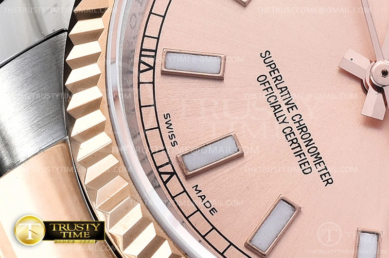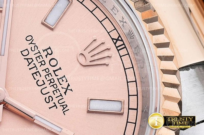 Часы Rolex из коллекции DateJust. Классические женские часы Rolex DateJust 36mm 116231-0096 премиального качества (Артикул магазина: RX-0481) оснащены надежным автоматическим механизмом с автоподзаводом (работает от амплитуды движения руки) калибра 3135, в котором реализованы следующие функции: часовая, минутная и секундная стрелки, а так же дата. Круглый корпус часов комбинированного сталь с розового золота цвета, имеющий размер 36 мм и высоту 12 мм превосходно дополнит образ и украсит запястье своего обладателя. Для изготовления часов Rolex DateJust 36mm 116231-0096 предлагаемых в нашем интернет-магазине, применяются нержавеющая сталь 316F высокого качества (Швейцарский стандарт), а так же сапфировое стекло высокой прочности, благодаря чему обеспечивается максимальная защита от сколов и механических повреждений. Отличительной чертой данной модели является золотой циферблат, часовые индексы которого обеспечивают часовые метки. Завершает образ браслет из нержавеющей стали комбинированного сталь с розовым золотом цвета с фирменной раскладывающейся застежкой Rolex. Водонепроницаемость данной модели составляет 30М (WR30) – допускается минимальное воздействие с водой.