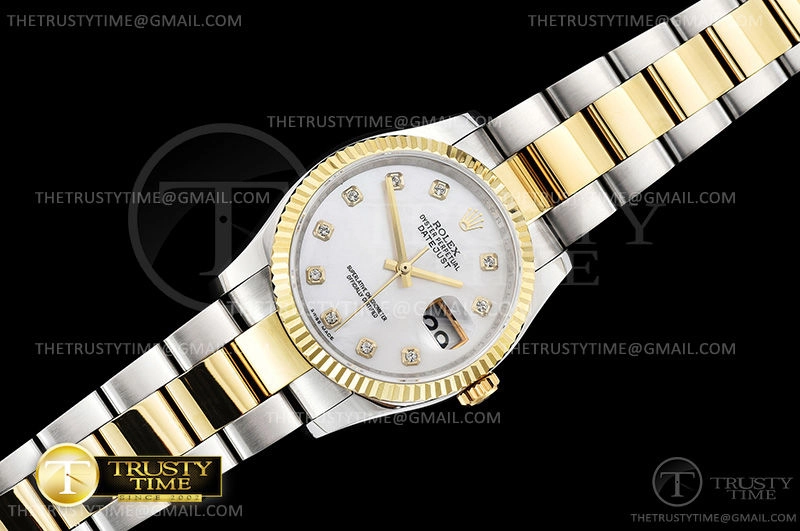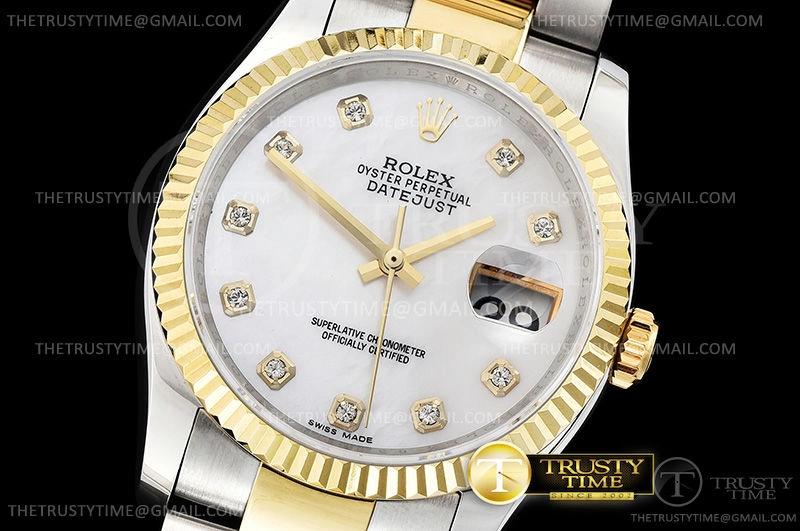 Часы Rolex из коллекции DateJust. Классические женские часы Rolex DateJust 36mm 126233-0024 премиального качества (Артикул магазина: RX-0462) оснащены надежным автоматическим механизмом с автоподзаводом (работает от амплитуды движения руки) калибра 3135, в котором реализованы следующие функции: часовая, минутная и секундная стрелки, а так же дата. Круглый корпус часов комбинированного сталь с желтого золота цвета, имеющий размер 36 мм и высоту 12 мм превосходно дополнит образ и украсит запястье своего обладателя. Для изготовления часов Rolex DateJust 36mm 126233-0024 предлагаемых в нашем интернет-магазине, применяются нержавеющая сталь 316F высокого качества (Швейцарский стандарт), а так же сапфировое стекло высокой прочности, благодаря чему обеспечивается максимальная защита от сколов и механических повреждений. Отличительной чертой данной модели является перламутровый циферблат, часовые индексы которого обеспечивают камни. Завершает образ браслет из нержавеющей стали комбинированного сталь с желтым золотом цвета с фирменной раскладывающейся застежкой Rolex. Водонепроницаемость данной модели составляет 30М (WR30) – допускается минимальное воздействие с водой.