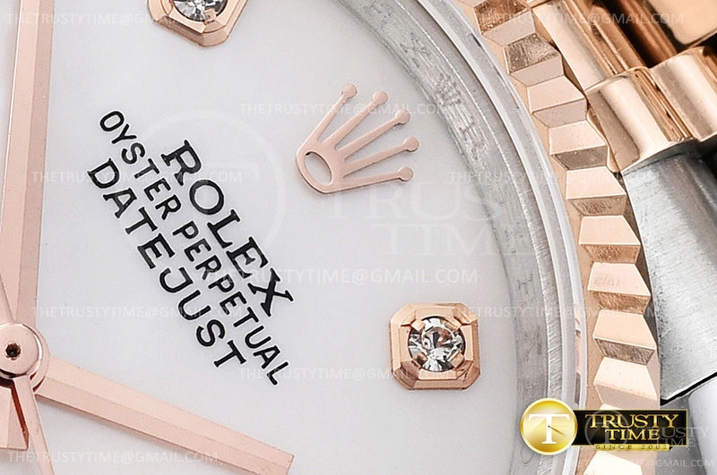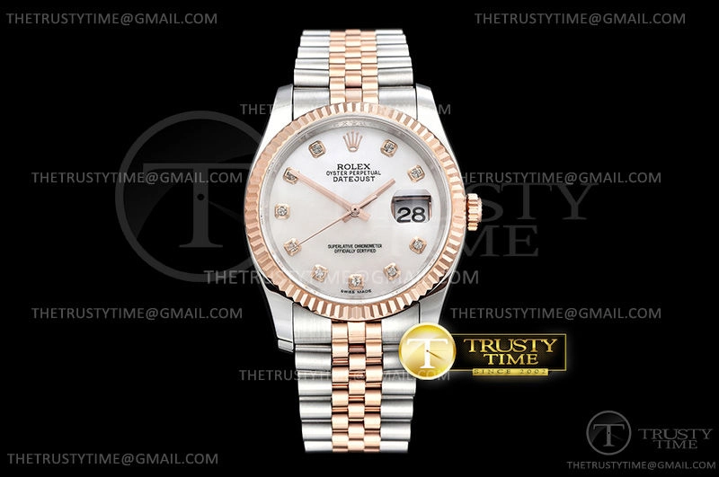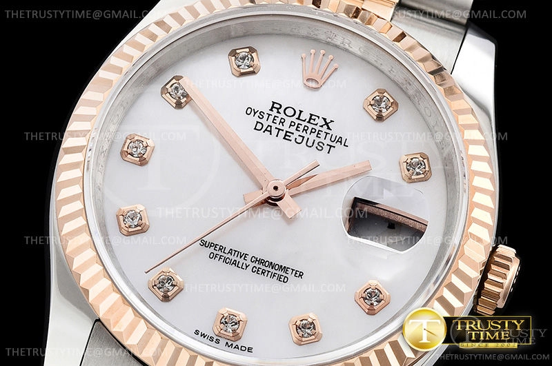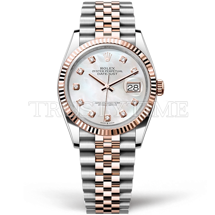 Часы Rolex из коллекции DateJust. Классические женские часы Rolex DateJust 36mm 126231-0021 премиального качества (Артикул магазина: RX-0452) оснащены надежным автоматическим механизмом с автоподзаводом (работает от амплитуды движения руки) калибра 3135, в котором реализованы следующие функции: часовая, минутная и секундная стрелки, а так же дата. Круглый корпус часов комбинированного сталь с розового золота цвета, имеющий размер 36 мм и высоту 12 мм превосходно дополнит образ и украсит запястье своего обладателя. Для изготовления часов Rolex DateJust 36mm 126231-0021 предлагаемых в нашем интернет-магазине, применяются нержавеющая сталь 316F высокого качества (Швейцарский стандарт), а так же сапфировое стекло высокой прочности, благодаря чему обеспечивается максимальная защита от сколов и механических повреждений. Отличительной чертой данной модели является перламутровый циферблат, часовые индексы которого обеспечивают камни. Завершает образ браслет из нержавеющей стали комбинированного сталь с розовым золотом цвета с фирменной раскладывающейся застежкой Rolex. Водонепроницаемость данной модели составляет 30М (WR30) – допускается минимальное воздействие с водой.