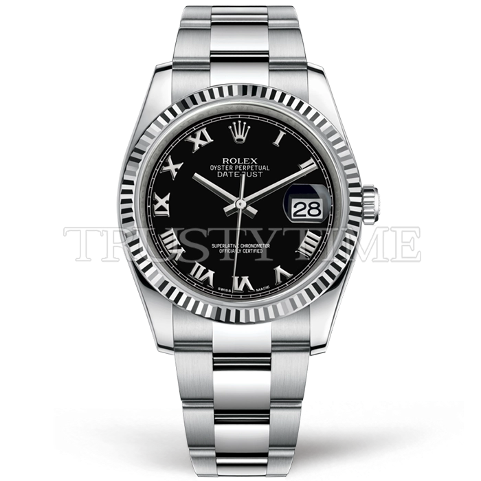 Часы Rolex из коллекции DateJust. Классические женские часы Rolex DateJust 36mm 116234-0146 премиального качества (Артикул магазина: RX-0447) оснащены надежным автоматическим механизмом с автоподзаводом (работает от амплитуды движения руки) калибра 3135, в котором реализованы следующие функции: часовая, минутная и секундная стрелки, а так же дата. Круглый корпус часов стального цвета, имеющий размер 36 мм и высоту 12 мм превосходно дополнит образ и украсит запястье своего обладателя. Для изготовления часов Rolex DateJust 36mm 116234-0146 предлагаемых в нашем интернет-магазине, применяются нержавеющая сталь 316F высокого качества (Швейцарский стандарт), а так же сапфировое стекло высокой прочности, благодаря чему обеспечивается максимальная защита от сколов и механических повреждений. Отличительной чертой данной модели является черный циферблат, часовые индексы которого обеспечивают римские цифры. Завершает образ браслет из нержавеющей стали стального цвета с фирменной раскладывающейся застежкой Rolex. Водонепроницаемость данной модели составляет 30М (WR30) – допускается минимальное воздействие с водой.