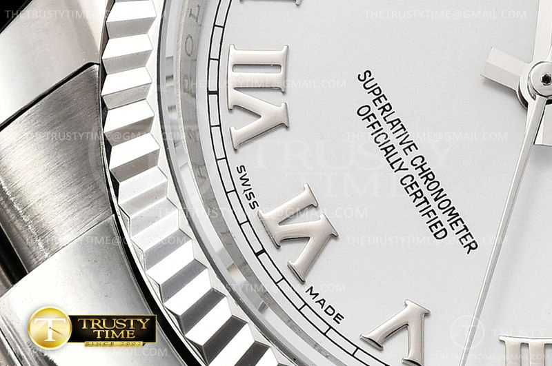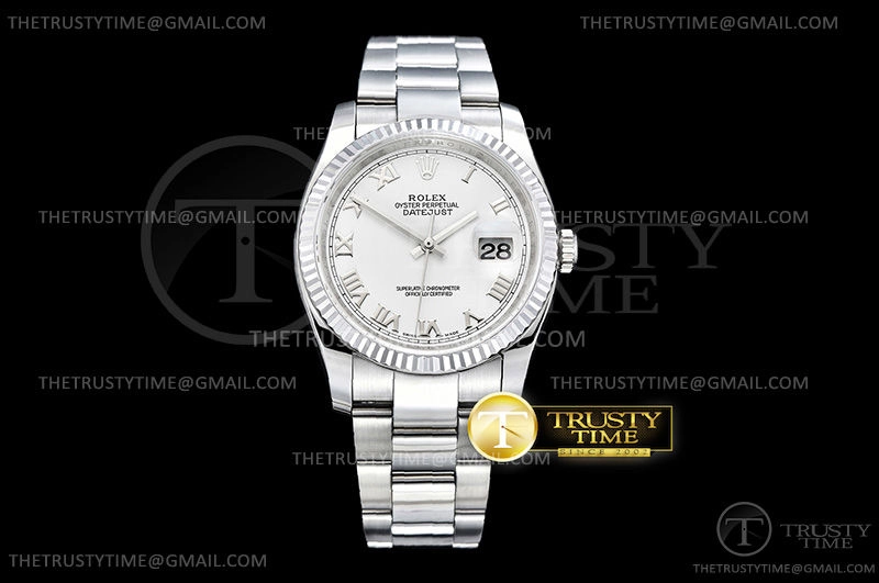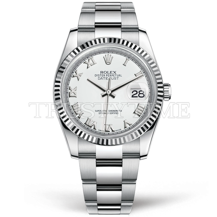 Часы Rolex из коллекции DateJust. Классические женские часы Rolex DateJust 36mm 116234-0090 премиального качества (Артикул магазина: RX-0448) оснащены надежным автоматическим механизмом с автоподзаводом (работает от амплитуды движения руки) калибра 3135, в котором реализованы следующие функции: часовая, минутная и секундная стрелки, а так же дата. Круглый корпус часов стального цвета, имеющий размер 36 мм и высоту 12 мм превосходно дополнит образ и украсит запястье своего обладателя. Для изготовления часов Rolex DateJust 36mm 116234-0090 предлагаемых в нашем интернет-магазине, применяются нержавеющая сталь 316F высокого качества (Швейцарский стандарт), а так же сапфировое стекло высокой прочности, благодаря чему обеспечивается максимальная защита от сколов и механических повреждений. Отличительной чертой данной модели является белый циферблат, часовые индексы которого обеспечивают римские цифры. Завершает образ браслет из нержавеющей стали стального цвета с фирменной раскладывающейся застежкой Rolex. Водонепроницаемость данной модели составляет 30М (WR30) – допускается минимальное воздействие с водой.