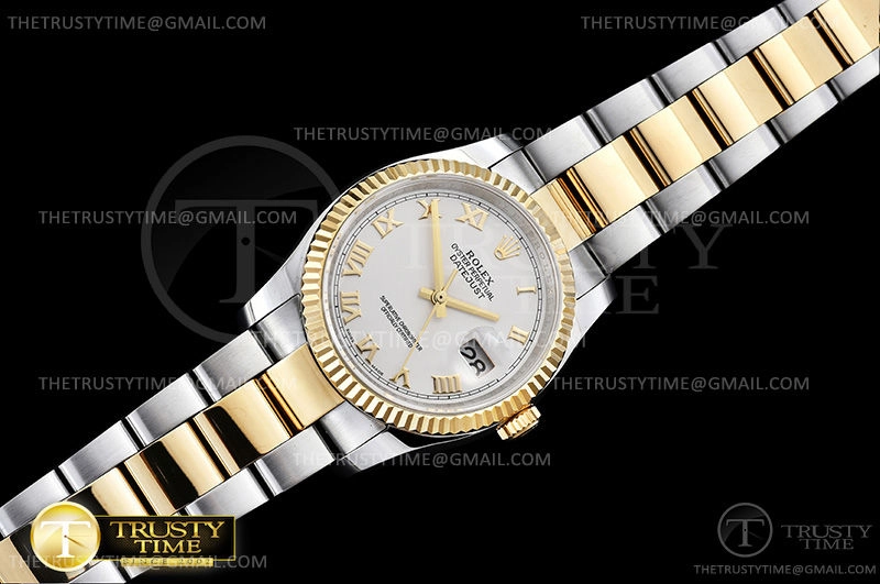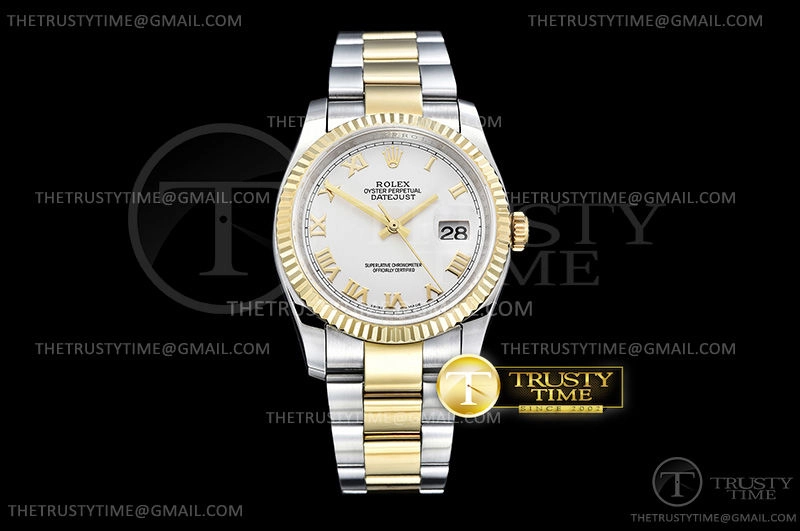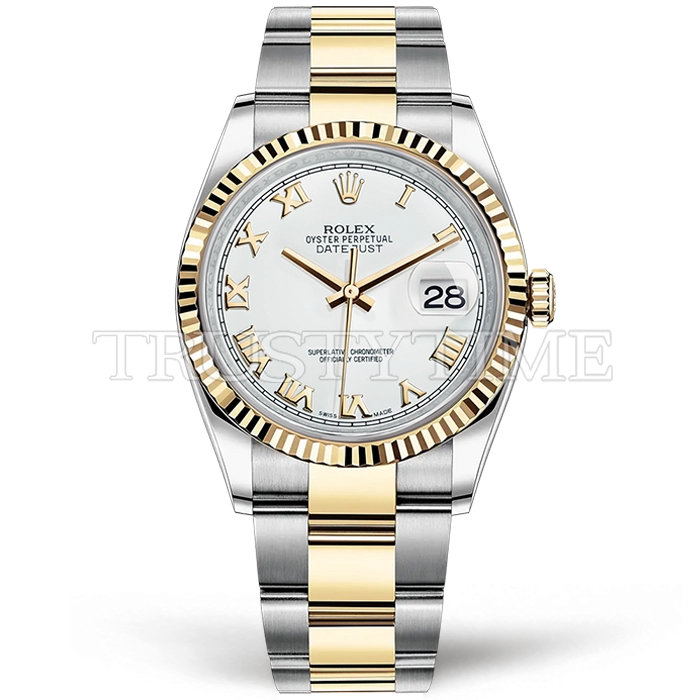 Часы Rolex из коллекции DateJust. Классические женские часы Rolex DateJust 36mm 116233-0178 премиального качества (Артикул магазина: RX-0449) оснащены надежным автоматическим механизмом с автоподзаводом (работает от амплитуды движения руки) калибра 3135, в котором реализованы следующие функции: часовая, минутная и секундная стрелки, а так же дата. Круглый корпус часов комбинированного сталь с желтого золота цвета, имеющий размер 36 мм и высоту 12 мм превосходно дополнит образ и украсит запястье своего обладателя. Для изготовления часов Rolex DateJust 36mm 116233-0178 предлагаемых в нашем интернет-магазине, применяются нержавеющая сталь 316F высокого качества (Швейцарский стандарт), а так же сапфировое стекло высокой прочности, благодаря чему обеспечивается максимальная защита от сколов и механических повреждений. Отличительной чертой данной модели является белый циферблат, часовые индексы которого обеспечивают римские цифры. Завершает образ браслет из нержавеющей стали комбинированного сталь с желтым золотом цвета с фирменной раскладывающейся застежкой Rolex. Водонепроницаемость данной модели составляет 30М (WR30) – допускается минимальное воздействие с водой.