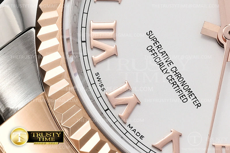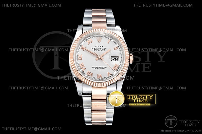 Часы Rolex из коллекции DateJust. Классические женские часы Rolex DateJust 36mm 116231-0092 премиального качества (Артикул магазина: RX-0451) оснащены надежным автоматическим механизмом с автоподзаводом (работает от амплитуды движения руки) калибра 3135, в котором реализованы следующие функции: часовая, минутная и секундная стрелки, а так же дата. Круглый корпус часов комбинированного сталь с розового золота цвета, имеющий размер 36 мм и высоту 12 мм превосходно дополнит образ и украсит запястье своего обладателя. Для изготовления часов Rolex DateJust 36mm 116231-0092 предлагаемых в нашем интернет-магазине, применяются нержавеющая сталь 316F высокого качества (Швейцарский стандарт), а так же сапфировое стекло высокой прочности, благодаря чему обеспечивается максимальная защита от сколов и механических повреждений. Отличительной чертой данной модели является белый циферблат, часовые индексы которого обеспечивают римские цифры. Завершает образ браслет из нержавеющей стали комбинированного сталь с розовым золотом цвета с фирменной раскладывающейся застежкой Rolex. Водонепроницаемость данной модели составляет 30М (WR30) – допускается минимальное воздействие с водой.