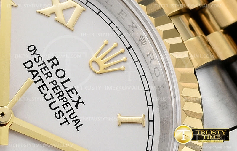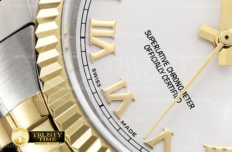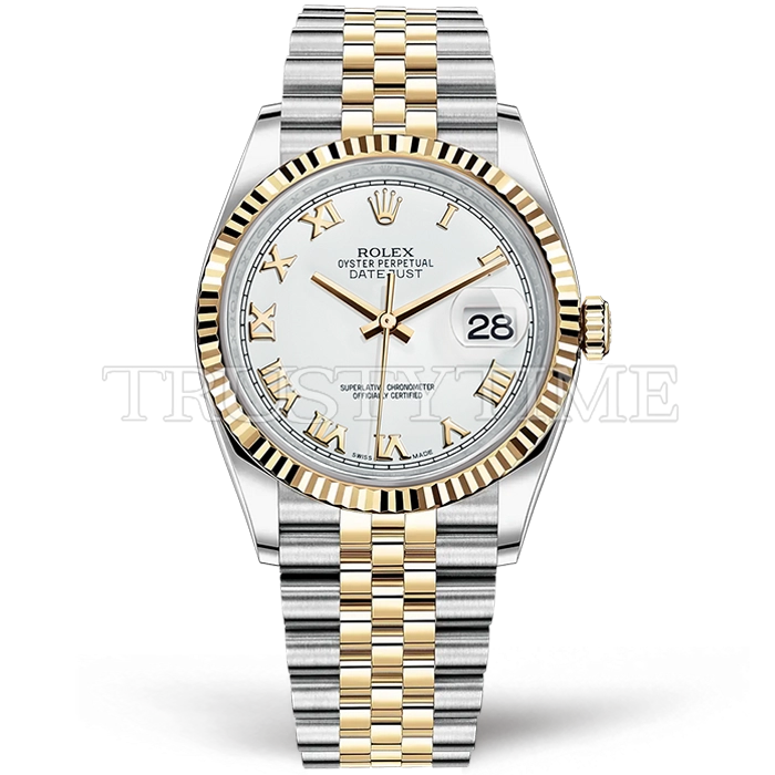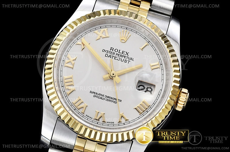 Часы Rolex из коллекции DateJust. Классические женские часы Rolex DateJust 36mm 116233-0149 премиального качества (Артикул магазина: RX-0443) оснащены надежным автоматическим механизмом с автоподзаводом (работает от амплитуды движения руки) калибра 3135, в котором реализованы следующие функции: часовая, минутная и секундная стрелки, а так же дата. Круглый корпус часов комбинированного сталь с желтого золота цвета, имеющий размер 36 мм и высоту 12 мм превосходно дополнит образ и украсит запястье своего обладателя. Для изготовления часов Rolex DateJust 36mm 116233-0149 предлагаемых в нашем интернет-магазине, применяются нержавеющая сталь 316F высокого качества (Швейцарский стандарт), а так же сапфировое стекло высокой прочности, благодаря чему обеспечивается максимальная защита от сколов и механических повреждений. Отличительной чертой данной модели является белый циферблат, часовые индексы которого обеспечивают римские цифры. Завершает образ браслет из нержавеющей стали комбинированного сталь с желтым золотом цвета с фирменной раскладывающейся застежкой Rolex. Водонепроницаемость данной модели составляет 30М (WR30) – допускается минимальное воздействие с водой.