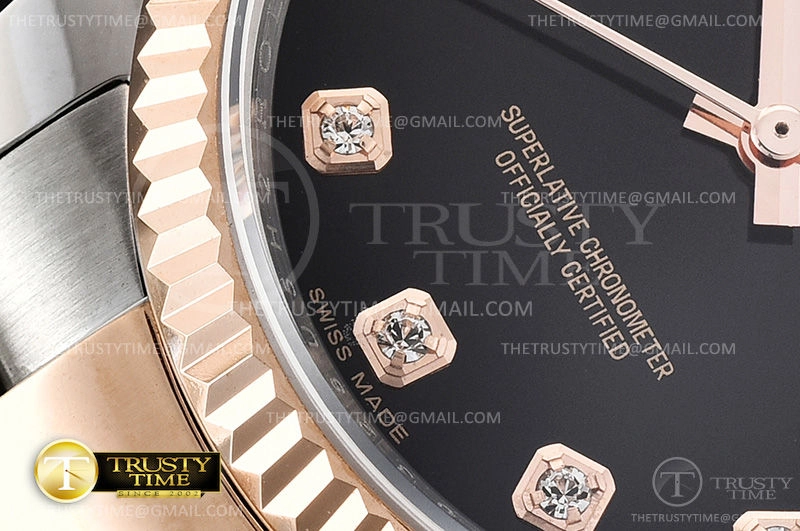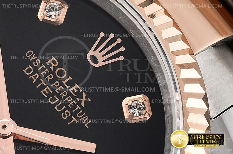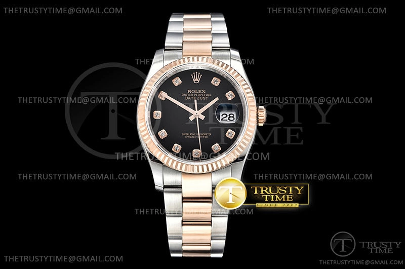 Часы Rolex из коллекции DateJust. Классические женские часы Rolex DateJust 36mm 116231-0071 премиального качества (Артикул магазина: RX-0430) оснащены надежным автоматическим механизмом с автоподзаводом (работает от амплитуды движения руки) калибра 3135, в котором реализованы следующие функции: часовая, минутная и секундная стрелки, а так же дата. Круглый корпус часов комбинированного сталь с розового золота цвета, имеющий размер 36 мм и высоту 12 мм превосходно дополнит образ и украсит запястье своего обладателя. Для изготовления часов Rolex DateJust 36mm 116231-0071 предлагаемых в нашем интернет-магазине, применяются нержавеющая сталь 316F высокого качества (Швейцарский стандарт), а так же сапфировое стекло высокой прочности, благодаря чему обеспечивается максимальная защита от сколов и механических повреждений. Отличительной чертой данной модели является черный циферблат, часовые индексы которого обеспечивают камни. Завершает образ браслет из нержавеющей стали комбинированного сталь с розовым золотом цвета с фирменной раскладывающейся застежкой Rolex. Водонепроницаемость данной модели составляет 30М (WR30) – допускается минимальное воздействие с водой.