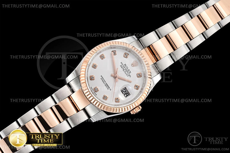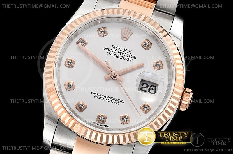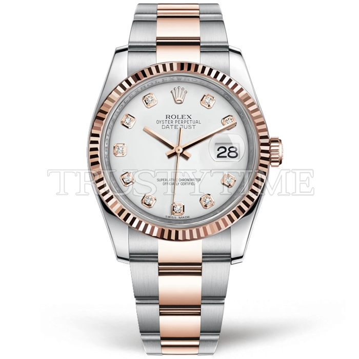 Часы Rolex из коллекции DateJust. Классические женские часы Rolex DateJust 36mm 116231-0063 премиального качества (Артикул магазина: RX-0431) оснащены надежным автоматическим механизмом с автоподзаводом (работает от амплитуды движения руки) калибра 3135, в котором реализованы следующие функции: часовая, минутная и секундная стрелки, а так же дата. Круглый корпус часов комбинированного сталь с розового золота цвета, имеющий размер 36 мм и высоту 12 мм превосходно дополнит образ и украсит запястье своего обладателя. Для изготовления часов Rolex DateJust 36mm 116231-0063 предлагаемых в нашем интернет-магазине, применяются нержавеющая сталь 316F высокого качества (Швейцарский стандарт), а так же сапфировое стекло высокой прочности, благодаря чему обеспечивается максимальная защита от сколов и механических повреждений. Отличительной чертой данной модели является белый циферблат, часовые индексы которого обеспечивают камни. Завершает образ браслет из нержавеющей стали комбинированного сталь с розовым золотом цвета с фирменной раскладывающейся застежкой Rolex. Водонепроницаемость данной модели составляет 30М (WR30) – допускается минимальное воздействие с водой.