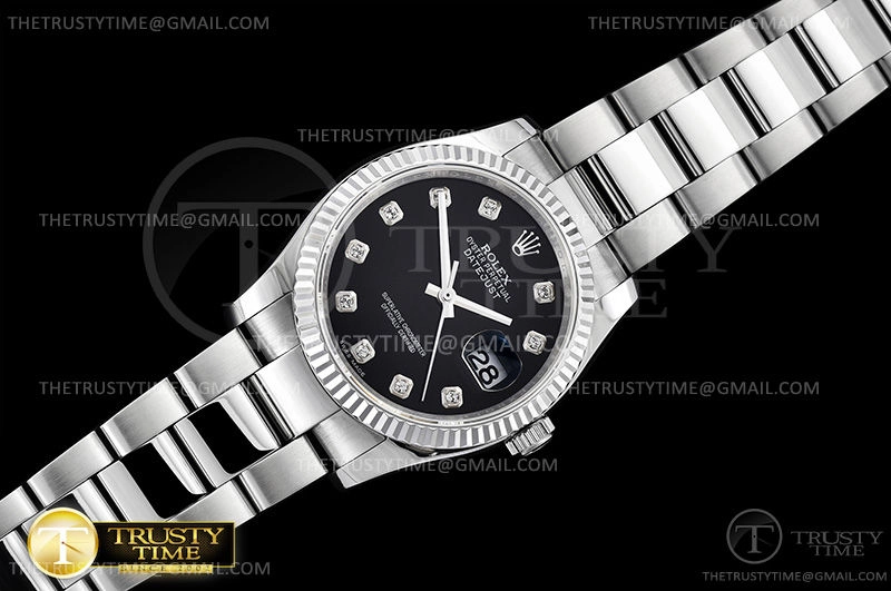 Часы Rolex из коллекции DateJust. Классические женские часы Rolex DateJust 36mm 116234-0132 премиального качества (Артикул магазина: RX-0432) оснащены надежным автоматическим механизмом с автоподзаводом (работает от амплитуды движения руки) калибра 3135, в котором реализованы следующие функции: часовая, минутная и секундная стрелки, а так же дата. Круглый корпус часов стального цвета, имеющий размер 36 мм и высоту 12 мм превосходно дополнит образ и украсит запястье своего обладателя. Для изготовления часов Rolex DateJust 36mm 116234-0132 предлагаемых в нашем интернет-магазине, применяются нержавеющая сталь 316F высокого качества (Швейцарский стандарт), а так же сапфировое стекло высокой прочности, благодаря чему обеспечивается максимальная защита от сколов и механических повреждений. Отличительной чертой данной модели является черный циферблат, часовые индексы которого обеспечивают камни. Завершает образ браслет из нержавеющей стали стального цвета с фирменной раскладывающейся застежкой Rolex. Водонепроницаемость данной модели составляет 30М (WR30) – допускается минимальное воздействие с водой.