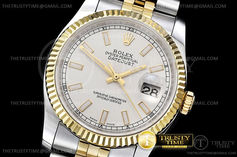 Часы Rolex из коллекции DateJust. Классические женские часы Rolex DateJust 36mm 116233-0200 премиального качества (Артикул магазина: RX-0421) оснащены надежным автоматическим механизмом с автоподзаводом (работает от амплитуды движения руки) калибра 3135, в котором реализованы следующие функции: часовая, минутная и секундная стрелки, а так же дата. Круглый корпус часов комбинированного сталь с желтого золота цвета, имеющий размер 36 мм и высоту 12 мм превосходно дополнит образ и украсит запястье своего обладателя. Для изготовления часов Rolex DateJust 36mm 116233-0200 предлагаемых в нашем интернет-магазине, применяются нержавеющая сталь 316F высокого качества (Швейцарский стандарт), а так же сапфировое стекло высокой прочности, благодаря чему обеспечивается максимальная защита от сколов и механических повреждений. Отличительной чертой данной модели является белый циферблат, часовые индексы которого обеспечивают часовые метки. Завершает образ браслет из нержавеющей стали комбинированного сталь с желтым золотом цвета с фирменной раскладывающейся застежкой Rolex. Водонепроницаемость данной модели составляет 30М (WR30) – допускается минимальное воздействие с водой.