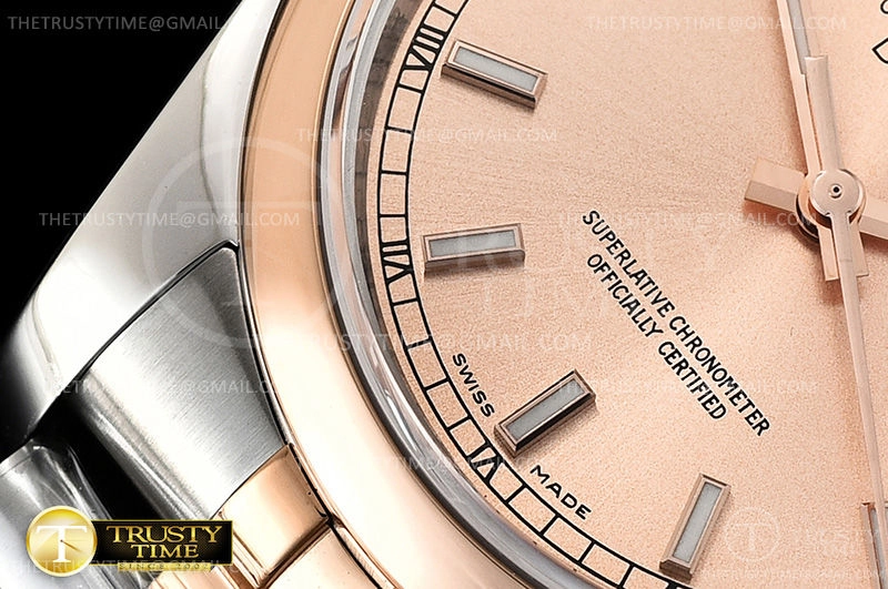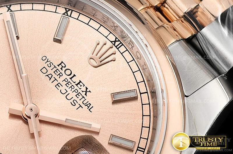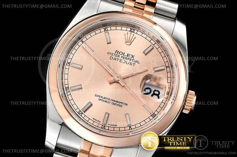 Часы Rolex из коллекции DateJust. Классические женские часы Rolex DateJust 36mm 116201-0097 премиального качества (Артикул магазина: RX-0413) оснащены надежным автоматическим механизмом с автоподзаводом (работает от амплитуды движения руки) калибра 3135, в котором реализованы следующие функции: часовая, минутная и секундная стрелки, а так же дата. Круглый корпус часов комбинированного сталь с розового золота цвета, имеющий размер 36 мм и высоту 12 мм превосходно дополнит образ и украсит запястье своего обладателя. Для изготовления часов Rolex DateJust 36mm 116201-0097 предлагаемых в нашем интернет-магазине, применяются нержавеющая сталь 904L высокого качества (Швейцарский стандарт), а так же сапфировое стекло высокой прочности, благодаря чему обеспечивается максимальная защита от сколов и механических повреждений. Отличительной чертой данной модели является золотой циферблат, часовые индексы которого обеспечивают часовые метки. Завершает образ браслет из нержавеющей стали комбинированного сталь с розовым золотом цвета с фирменной раскладывающейся застежкой Rolex. Водонепроницаемость данной модели составляет 30М (WR30) – допускается минимальное воздействие с водой.