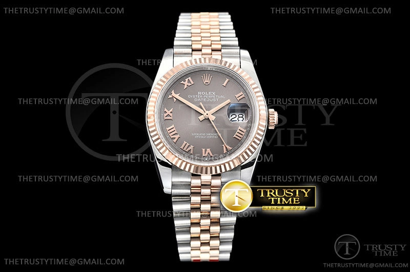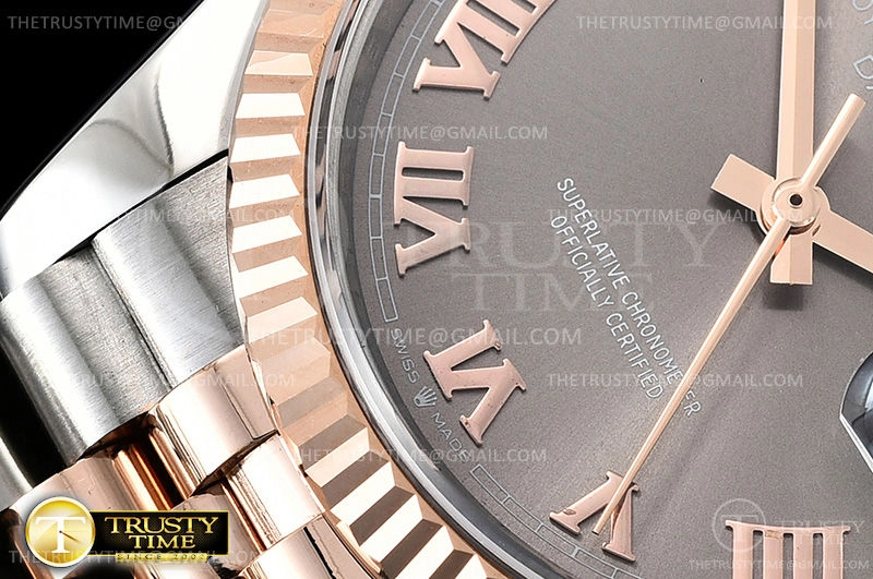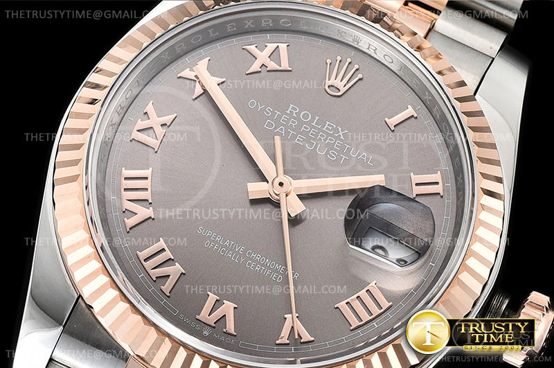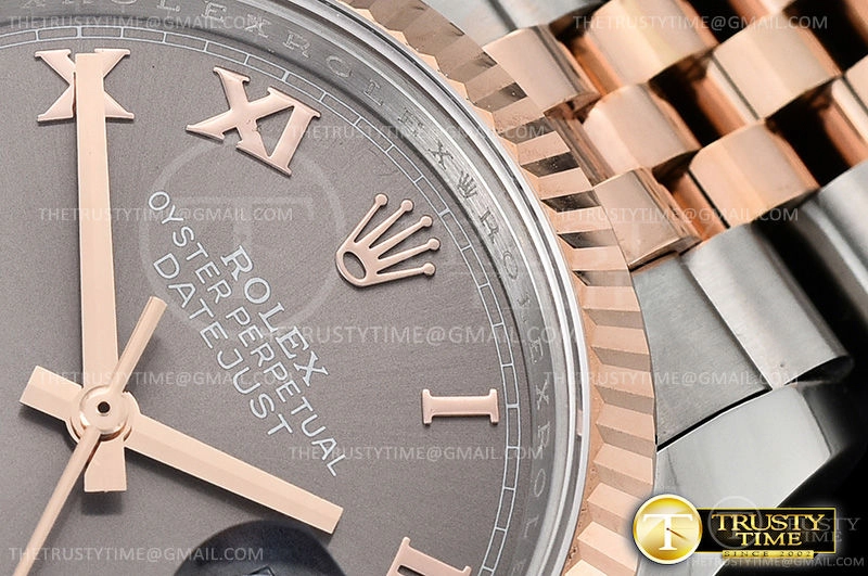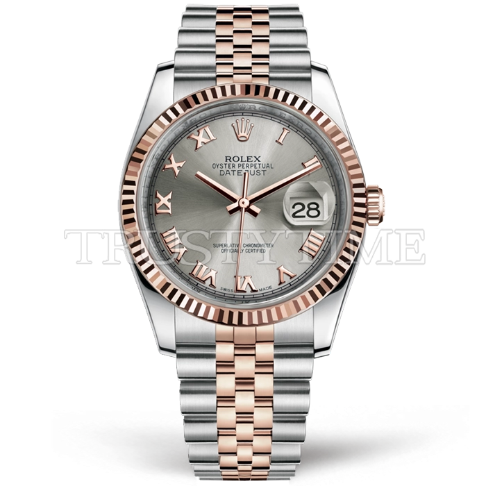 Часы Rolex из коллекции DateJust. Классические женские часы Rolex DateJust 36mm 116231-0087 премиального качества (Артикул магазина: RX-0377) оснащены надежным автоматическим механизмом с автоподзаводом (работает от амплитуды движения руки) калибра 3135, в котором реализованы следующие функции: часовая, минутная и секундная стрелки, а так же дата. Круглый корпус часов комбинированного сталь с розового золота цвета, имеющий размер 36 мм и высоту 12 мм превосходно дополнит образ и украсит запястье своего обладателя. Для изготовления часов Rolex DateJust 36mm 116231-0087 предлагаемых в нашем интернет-магазине, применяются нержавеющая сталь 904L высокого качества (Швейцарский стандарт), а так же сапфировое стекло высокой прочности, благодаря чему обеспечивается максимальная защита от сколов и механических повреждений. Отличительной чертой данной модели является серый циферблат, часовые индексы которого обеспечивают римские цифры. Завершает образ браслет из нержавеющей стали комбинированного сталь с розовым золотом цвета с фирменной раскладывающейся застежкой Rolex. Водонепроницаемость данной модели составляет 30М (WR30) – допускается минимальное воздействие с водой.