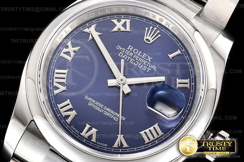 Часы Rolex из коллекции DateJust. Классические женские часы Rolex DateJust 36mm 116200-0060 премиального качества (Артикул магазина: RX-0287) оснащены надежным автоматическим механизмом с автоподзаводом (работает от амплитуды движения руки) калибра 3135, в котором реализованы следующие функции: часовая, минутная и секундная стрелки, а так же дата. Круглый корпус часов стального цвета, имеющий размер 36 мм и высоту 12 мм превосходно дополнит образ и украсит запястье своего обладателя. Для изготовления часов Rolex DateJust 36mm 116200-0060 предлагаемых в нашем интернет-магазине, применяются нержавеющая сталь 904L высокого качества (Швейцарский стандарт), а так же сапфировое стекло высокой прочности, благодаря чему обеспечивается максимальная защита от сколов и механических повреждений. Отличительной чертой данной модели является синий циферблат, часовые индексы которого обеспечивают римские цифры. Завершает образ браслет из нержавеющей стали стального цвета с фирменной раскладывающейся застежкой Rolex. Водонепроницаемость данной модели составляет 30М (WR30) – допускается минимальное воздействие с водой.