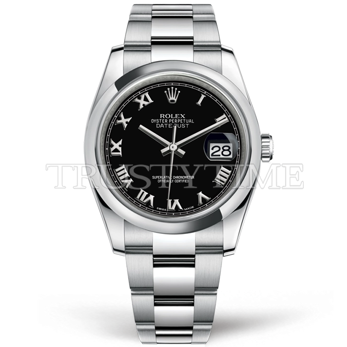 Часы Rolex из коллекции DateJust. Классические женские часы Rolex DateJust 36mm 116200-0061 премиального качества (Артикул магазина: RX-0290) оснащены надежным автоматическим механизмом с автоподзаводом (работает от амплитуды движения руки) калибра 3135, в котором реализованы следующие функции: часовая, минутная и секундная стрелки, а так же дата. Круглый корпус часов стального цвета, имеющий размер 36 мм и высоту 12 мм превосходно дополнит образ и украсит запястье своего обладателя. Для изготовления часов Rolex DateJust 36mm 116200-0061 предлагаемых в нашем интернет-магазине, применяются нержавеющая сталь 904L высокого качества (Швейцарский стандарт), а так же сапфировое стекло высокой прочности, благодаря чему обеспечивается максимальная защита от сколов и механических повреждений. Отличительной чертой данной модели является черный циферблат, часовые индексы которого обеспечивают римские цифры. Завершает образ браслет из нержавеющей стали стального цвета с фирменной раскладывающейся застежкой Rolex. Водонепроницаемость данной модели составляет 30М (WR30) – допускается минимальное воздействие с водой.