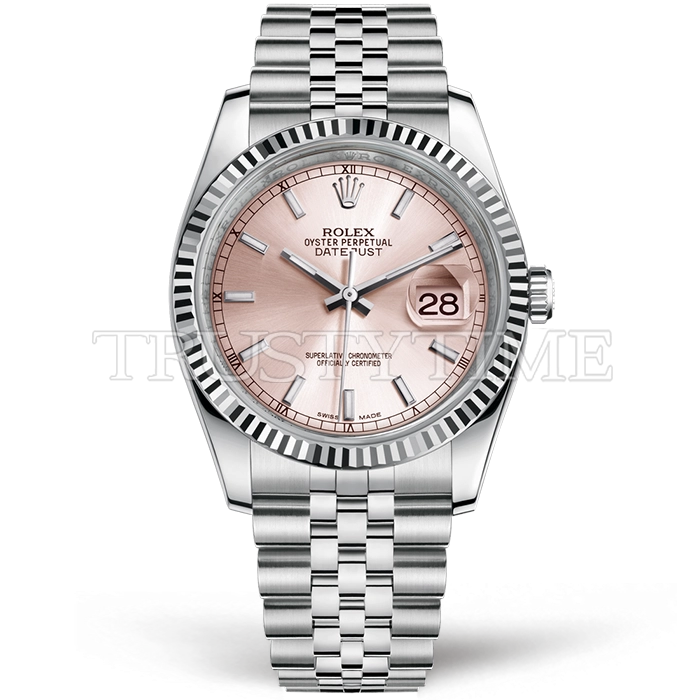 Часы Rolex из коллекции DateJust. Классические женские часы Rolex DateJust 36mm 116234-0108 премиального качества (Артикул магазина: RX-0265) оснащены надежным автоматическим механизмом с автоподзаводом (работает от амплитуды движения руки) калибра 3135, в котором реализованы следующие функции: часовая, минутная и секундная стрелки, а так же дата. Круглый корпус часов стального цвета, имеющий размер 36 мм и высоту 12 мм превосходно дополнит образ и украсит запястье своего обладателя. Для изготовления часов Rolex DateJust 36mm 116234-0108 предлагаемых в нашем интернет-магазине, применяются нержавеющая сталь 904L высокого качества (Швейцарский стандарт), а так же сапфировое стекло высокой прочности, благодаря чему обеспечивается максимальная защита от сколов и механических повреждений. Отличительной чертой данной модели является розовый циферблат, часовые индексы которого обеспечивают часовые метки. Завершает образ браслет из нержавеющей стали стального цвета с фирменной раскладывающейся застежкой Rolex. Водонепроницаемость данной модели составляет 30М (WR30) – допускается минимальное воздействие с водой.