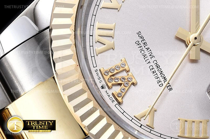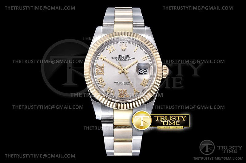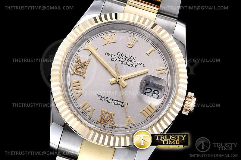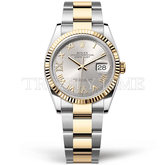 Часы Rolex из коллекции DateJust. Классические женские часы Rolex DateJust 36mm 126233-0032 премиального качества (Артикул магазина: RX-0254) оснащены надежным автоматическим механизмом с автоподзаводом (работает от амплитуды движения руки) калибра 3235, в котором реализованы следующие функции: часовая, минутная и секундная стрелки, а так же дата. Круглый корпус часов комбинированного сталь с желтого золота цвета, имеющий размер 36 мм и высоту 12 мм превосходно дополнит образ и украсит запястье своего обладателя. Для изготовления часов Rolex DateJust 36mm 126233-0032 предлагаемых в нашем интернет-магазине, применяются нержавеющая сталь 904L высокого качества (Швейцарский стандарт), а так же сапфировое стекло высокой прочности, благодаря чему обеспечивается максимальная защита от сколов и механических повреждений. Отличительной чертой данной модели является серебристый циферблат, часовые индексы которого обеспечивают римские цифры. Завершает образ браслет из нержавеющей стали комбинированного сталь с желтым золотом цвета с фирменной раскладывающейся застежкой Rolex. Водонепроницаемость данной модели составляет 30М (WR30) – допускается минимальное воздействие с водой.