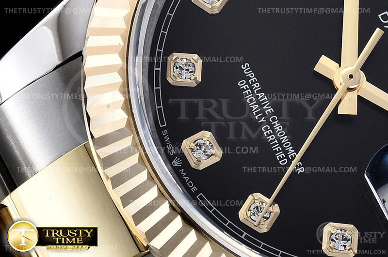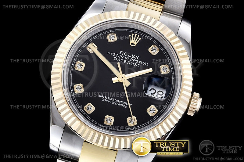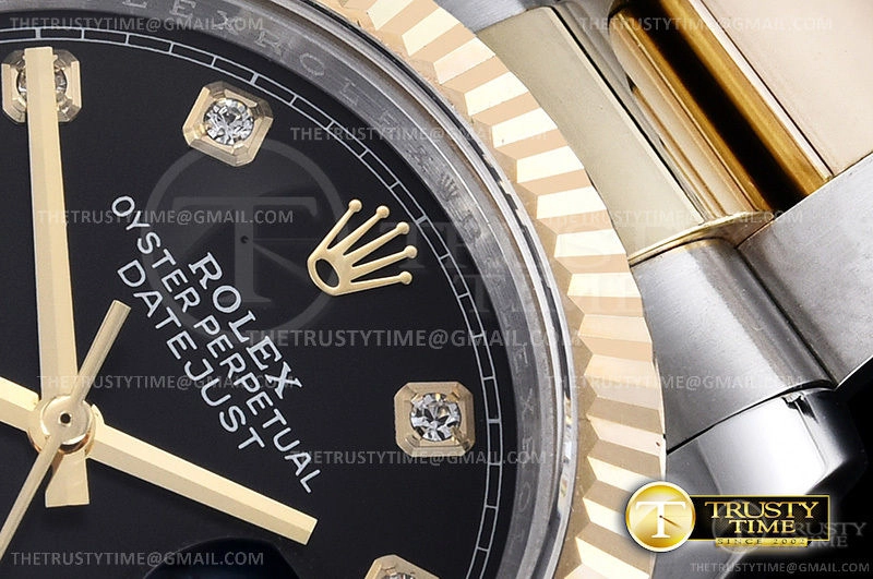Часы Rolex из коллекции DateJust. Классические женские часы Rolex DateJust 36mm 126233-0022 премиального качества (Артикул магазина: RX-0243) оснащены надежным автоматическим механизмом с автоподзаводом (работает от амплитуды движения руки) калибра 3235, в котором реализованы следующие функции: часовая, минутная и секундная стрелки, а так же дата. Круглый корпус часов комбинированного сталь с желтого золота цвета, имеющий размер 36 мм и высоту 12 мм превосходно дополнит образ и украсит запястье своего обладателя. Для изготовления часов Rolex DateJust 36mm 126233-0022 предлагаемых в нашем интернет-магазине, применяются нержавеющая сталь 904L высокого качества (Швейцарский стандарт), а так же сапфировое стекло высокой прочности, благодаря чему обеспечивается максимальная защита от сколов и механических повреждений. Отличительной чертой данной модели является черный циферблат, часовые индексы которого обеспечивают камни. Завершает образ браслет из нержавеющей стали комбинированного сталь с желтым золотом цвета с фирменной раскладывающейся застежкой Rolex. Водонепроницаемость данной модели составляет 30М (WR30) – допускается минимальное воздействие с водой.