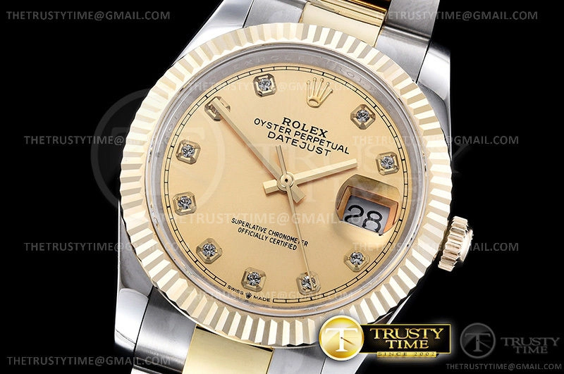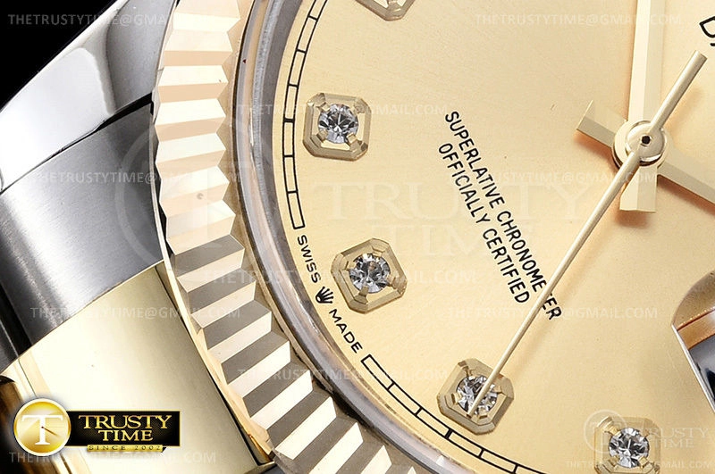 Часы Rolex из коллекции DateJust. Классические женские часы Rolex DateJust 36mm 126233-0018 премиального качества (Артикул магазина: RX-0245) оснащены надежным автоматическим механизмом с автоподзаводом (работает от амплитуды движения руки) калибра 3235, в котором реализованы следующие функции: часовая, минутная и секундная стрелки, а так же дата. Круглый корпус часов комбинированного сталь с желтого золота цвета, имеющий размер 36 мм и высоту 12 мм превосходно дополнит образ и украсит запястье своего обладателя. Для изготовления часов Rolex DateJust 36mm 126233-0018 предлагаемых в нашем интернет-магазине, применяются нержавеющая сталь 904L высокого качества (Швейцарский стандарт), а так же сапфировое стекло высокой прочности, благодаря чему обеспечивается максимальная защита от сколов и механических повреждений. Отличительной чертой данной модели является золотой циферблат, часовые индексы которого обеспечивают камни. Завершает образ браслет из нержавеющей стали комбинированного сталь с желтым золотом цвета с фирменной раскладывающейся застежкой Rolex. Водонепроницаемость данной модели составляет 30М (WR30) – допускается минимальное воздействие с водой.