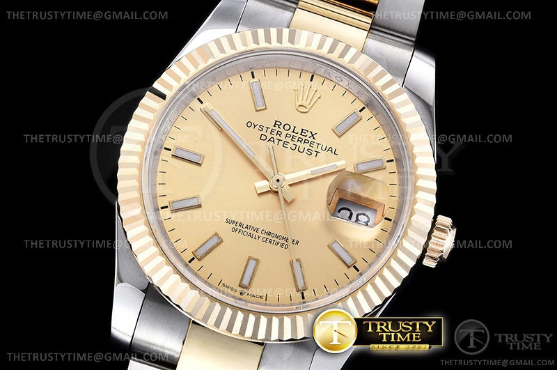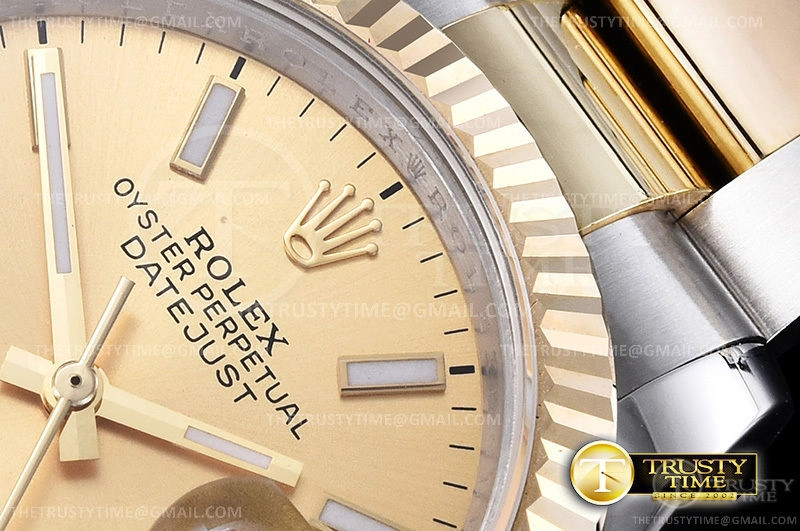 Часы Rolex из коллекции DateJust. Классические женские часы Rolex DateJust 36mm 126233-0016 премиального качества (Артикул магазина: RX-0249) оснащены надежным автоматическим механизмом с автоподзаводом (работает от амплитуды движения руки) калибра 3235, в котором реализованы следующие функции: часовая, минутная и секундная стрелки, а так же дата. Круглый корпус часов комбинированного сталь с желтого золота цвета, имеющий размер 36 мм и высоту 12 мм превосходно дополнит образ и украсит запястье своего обладателя. Для изготовления часов Rolex DateJust 36mm 126233-0016 предлагаемых в нашем интернет-магазине, применяются нержавеющая сталь 904L высокого качества (Швейцарский стандарт), а так же сапфировое стекло высокой прочности, благодаря чему обеспечивается максимальная защита от сколов и механических повреждений. Отличительной чертой данной модели является золотой циферблат, часовые индексы которого обеспечивают часовые метки. Завершает образ браслет из нержавеющей стали комбинированного сталь с желтым золотом цвета с фирменной раскладывающейся застежкой Rolex. Водонепроницаемость данной модели составляет 30М (WR30) – допускается минимальное воздействие с водой.