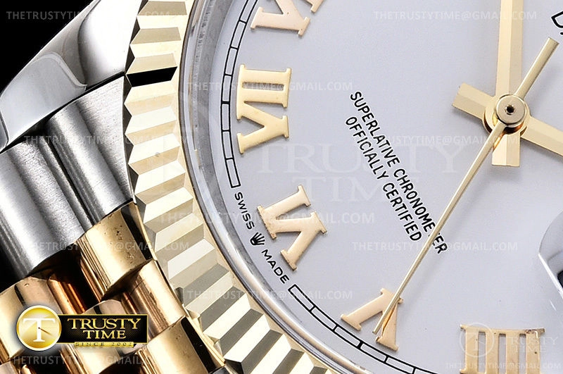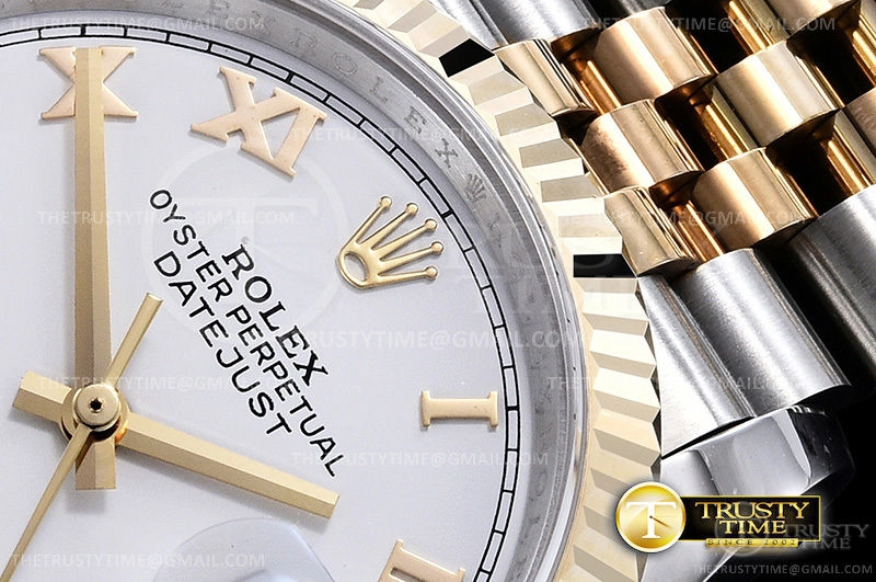 Часы Rolex из коллекции DateJust. Классические женские часы Rolex DateJust 36mm 126233-0029 премиального качества (Артикул магазина: RX-0212) оснащены надежным автоматическим механизмом с автоподзаводом (работает от амплитуды движения руки) калибра 3235, в котором реализованы следующие функции: часовая, минутная и секундная стрелки, а так же дата. Круглый корпус часов комбинированного сталь с желтого золота цвета, имеющий размер 36 мм и высоту 12 мм превосходно дополнит образ и украсит запястье своего обладателя. Для изготовления часов Rolex DateJust 36mm 126233-0029 предлагаемых в нашем интернет-магазине, применяются нержавеющая сталь 316F высокого качества (Швейцарский стандарт), а так же сапфировое стекло высокой прочности, благодаря чему обеспечивается максимальная защита от сколов и механических повреждений. Отличительной чертой данной модели является белый циферблат, часовые индексы которого обеспечивают римские цифры. Завершает образ браслет из нержавеющей стали комбинированного сталь с желтым золотом цвета с фирменной раскладывающейся застежкой Rolex. Водонепроницаемость данной модели составляет 30М (WR30) – допускается минимальное воздействие с водой.