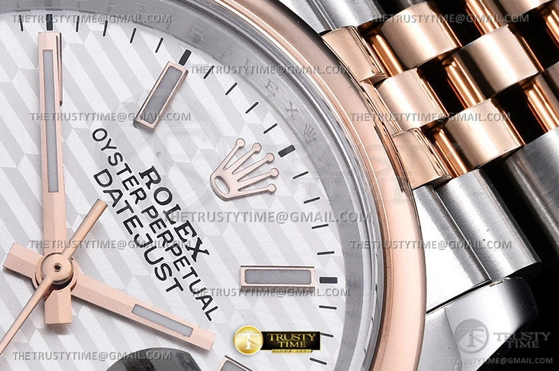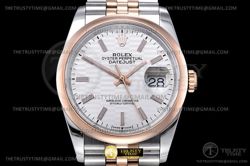 Часы Rolex из коллекции DateJust. Классические женские часы Rolex DateJust 36mm 126201-0033 премиального качества (Артикул магазина: RX-2126) оснащены надежным автоматическим механизмом с автоподзаводом (работает от амплитуды движения руки) калибра 3235, в котором реализованы следующие функции: часовая, минутная и секундная стрелки, а так же дата. Круглый корпус часов комбинированного сталь с розового золота цвета, имеющий размер 36 мм и высоту 12 мм превосходно дополнит образ и украсит запястье своего обладателя. Для изготовления часов Rolex DateJust 36mm 126201-0033 предлагаемых в нашем интернет-магазине, применяются нержавеющая сталь 316L высокого качества (Швейцарский стандарт), а так же сапфировое стекло высокой прочности, благодаря чему обеспечивается максимальная защита от сколов и механических повреждений. Отличительной чертой данной модели является серебристый циферблат, часовые индексы которого обеспечивают часовые метки. Завершает образ браслет из нержавеющей стали комбинированного сталь с розовым золотом цвета с фирменной раскладывающейся застежкой Rolex. Водонепроницаемость данной модели составляет 30М (WR30) – допускается минимальное воздействие с водой.