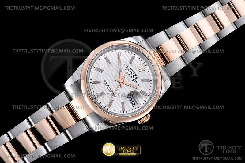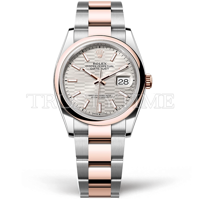 Часы Rolex из коллекции DateJust. Классические женские часы Rolex DateJust 36mm 126201-0034 премиального качества (Артикул магазина: RX-2120) оснащены надежным автоматическим механизмом с автоподзаводом (работает от амплитуды движения руки) калибра 3235, в котором реализованы следующие функции: часовая, минутная и секундная стрелки, а так же дата. Круглый корпус часов комбинированного сталь с розового золота цвета, имеющий размер 36 мм и высоту 12 мм превосходно дополнит образ и украсит запястье своего обладателя. Для изготовления часов Rolex DateJust 36mm 126201-0034 предлагаемых в нашем интернет-магазине, применяются нержавеющая сталь 316L высокого качества (Швейцарский стандарт), а так же сапфировое стекло высокой прочности, благодаря чему обеспечивается максимальная защита от сколов и механических повреждений. Отличительной чертой данной модели является серебристый циферблат, часовые индексы которого обеспечивают часовые метки. Завершает образ браслет из нержавеющей стали комбинированного сталь с розовым золотом цвета с фирменной раскладывающейся застежкой Rolex. Водонепроницаемость данной модели составляет 30М (WR30) – допускается минимальное воздействие с водой.