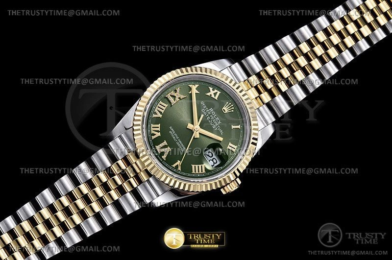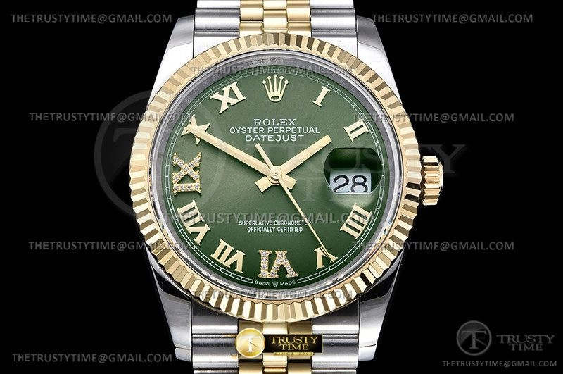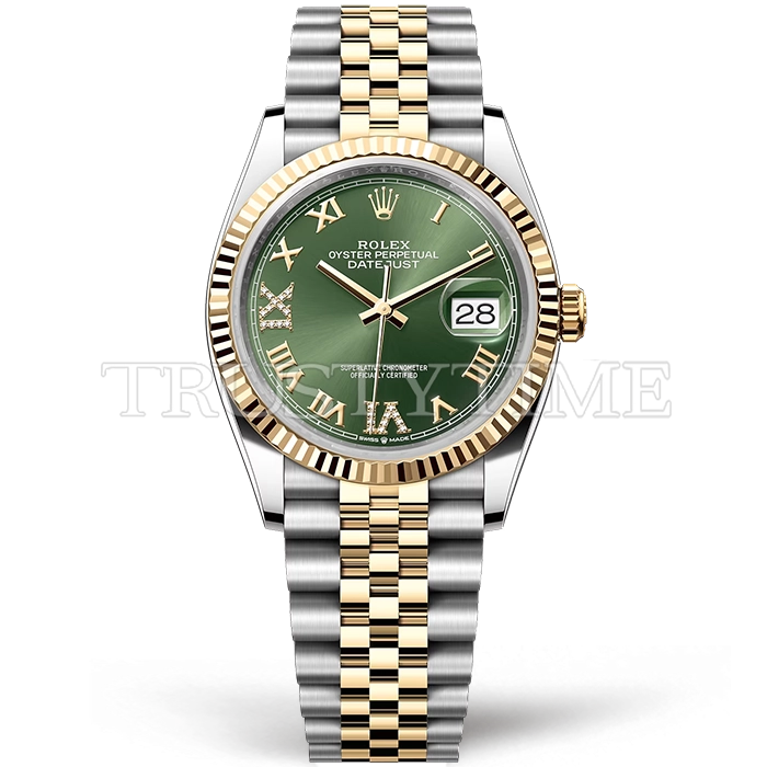 Часы Rolex из коллекции DateJust. Классические женские часы Rolex DateJust 36mm 126233-0025 премиального качества (Артикул магазина: RX-2271) оснащены надежным автоматическим механизмом с автоподзаводом (работает от амплитуды движения руки) калибра 3235, в котором реализованы следующие функции: часовая, минутная и секундная стрелки, а так же дата. Круглый корпус часов комбинированного сталь с желтого золота цвета, имеющий размер 36 мм и высоту 12 мм превосходно дополнит образ и украсит запястье своего обладателя. Для изготовления часов Rolex DateJust 36mm 126233-0025 предлагаемых в нашем интернет-магазине, применяются нержавеющая сталь 904L высокого качества (Швейцарский стандарт), а так же сапфировое стекло высокой прочности, благодаря чему обеспечивается максимальная защита от сколов и механических повреждений. Отличительной чертой данной модели является зеленый циферблат, часовые индексы которого обеспечивают римские цифры. Завершает образ браслет из нержавеющей стали комбинированного сталь с желтым золотом цвета с фирменной раскладывающейся застежкой Rolex. Водонепроницаемость данной модели составляет 30М (WR30) – допускается минимальное воздействие с водой.