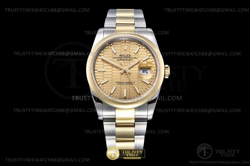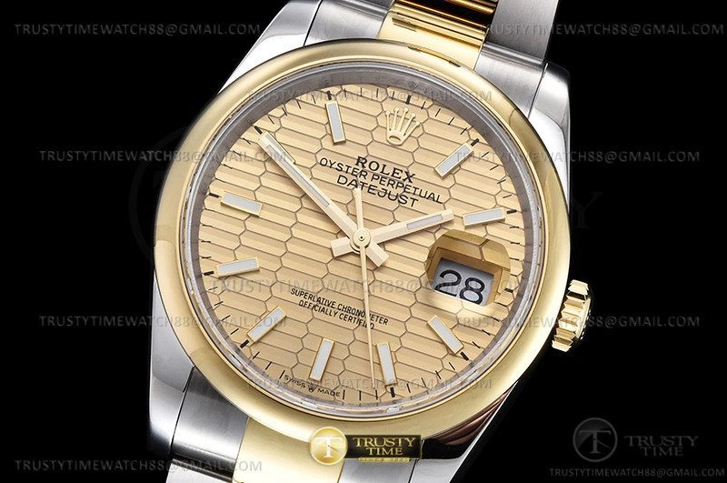 Часы Rolex из коллекции DateJust. Классические женские часы Rolex DateJust 36mm 126203-0040 премиального качества (Артикул магазина: RX-2331) оснащены надежным автоматическим механизмом с автоподзаводом (работает от амплитуды движения руки) калибра 3235, в котором реализованы следующие функции: часовая, минутная и секундная стрелки, а так же дата. Круглый корпус часов комбинированного сталь с желтого золота цвета, имеющий размер 36 мм и высоту 12 мм превосходно дополнит образ и украсит запястье своего обладателя. Для изготовления часов Rolex DateJust 36mm 126203-0040 предлагаемых в нашем интернет-магазине, применяются нержавеющая сталь 904L высокого качества (Швейцарский стандарт), а так же сапфировое стекло высокой прочности, благодаря чему обеспечивается максимальная защита от сколов и механических повреждений. Отличительной чертой данной модели является золотой циферблат, часовые индексы которого обеспечивают часовые метки. Завершает образ браслет из нержавеющей стали комбинированного сталь с желтым золотом цвета с фирменной раскладывающейся застежкой Rolex. Водонепроницаемость данной модели составляет 30М (WR30) – допускается минимальное воздействие с водой.
