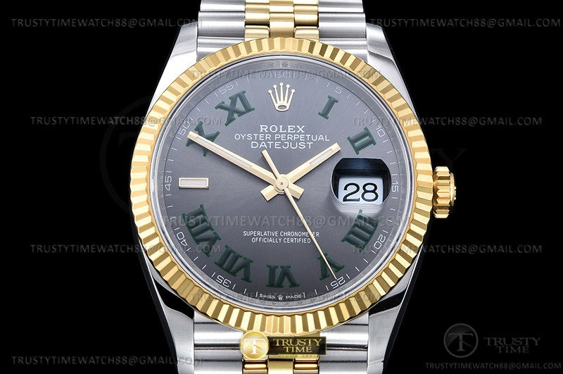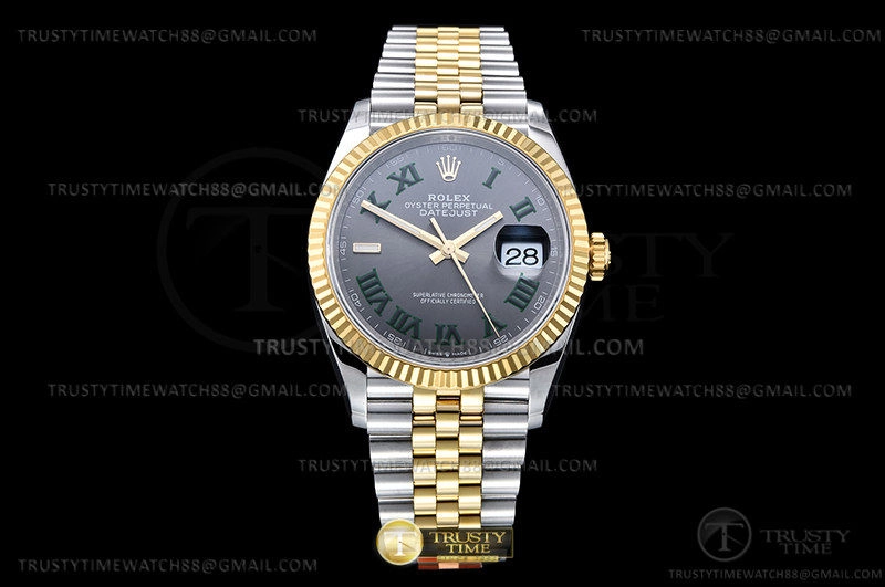 Часы Rolex из коллекции DateJust. Классические женские часы Rolex DateJust 36mm 126233-0035 премиального качества (Артикул магазина: RX-2545) оснащены надежным автоматическим механизмом с автоподзаводом (работает от амплитуды движения руки) калибра 3235, в котором реализованы следующие функции: часовая, минутная и секундная стрелки, а так же дата. Круглый корпус часов комбинированного сталь с желтого золота цвета, имеющий размер 36 мм и высоту 12 мм превосходно дополнит образ и украсит запястье своего обладателя. Для изготовления часов Rolex DateJust 36mm 126233-0035 предлагаемых в нашем интернет-магазине, применяются нержавеющая сталь 316L высокого качества (Швейцарский стандарт), а так же сапфировое стекло высокой прочности, благодаря чему обеспечивается максимальная защита от сколов и механических повреждений. Отличительной чертой данной модели является серый циферблат, часовые индексы которого обеспечивают римские цифры. Завершает образ браслет из нержавеющей стали комбинированного сталь с желтым золотом цвета с фирменной раскладывающейся застежкой Rolex. Водонепроницаемость данной модели составляет 30М (WR30) – допускается минимальное воздействие с водой.