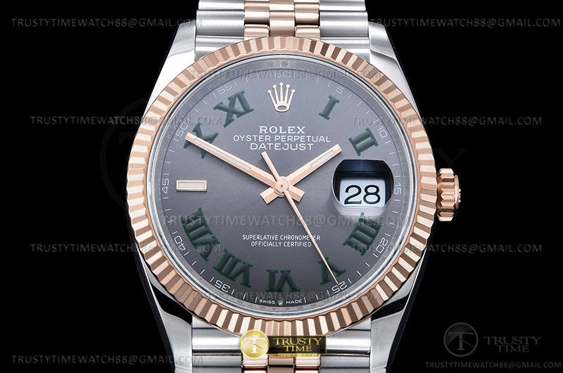 Часы Rolex из коллекции DateJust. Классические женские часы Rolex DateJust 36mm 126231-0029 премиального качества (Артикул магазина: RX-2101) оснащены надежным автоматическим механизмом с автоподзаводом (работает от амплитуды движения руки) калибра 3235, в котором реализованы следующие функции: часовая, минутная и секундная стрелки, а так же дата. Круглый корпус часов комбинированного сталь с розового золота цвета, имеющий размер 36 мм и высоту 12 мм превосходно дополнит образ и украсит запястье своего обладателя. Для изготовления часов Rolex DateJust 36mm 126231-0029 предлагаемых в нашем интернет-магазине, применяются нержавеющая сталь 904L высокого качества (Швейцарский стандарт), а так же сапфировое стекло высокой прочности, благодаря чему обеспечивается максимальная защита от сколов и механических повреждений. Отличительной чертой данной модели является серый циферблат, часовые индексы которого обеспечивают римские цифры. Завершает образ браслет из нержавеющей стали комбинированного сталь с розовым золотом цвета с фирменной раскладывающейся застежкой Rolex. Водонепроницаемость данной модели составляет 30М (WR30) – допускается минимальное воздействие с водой.