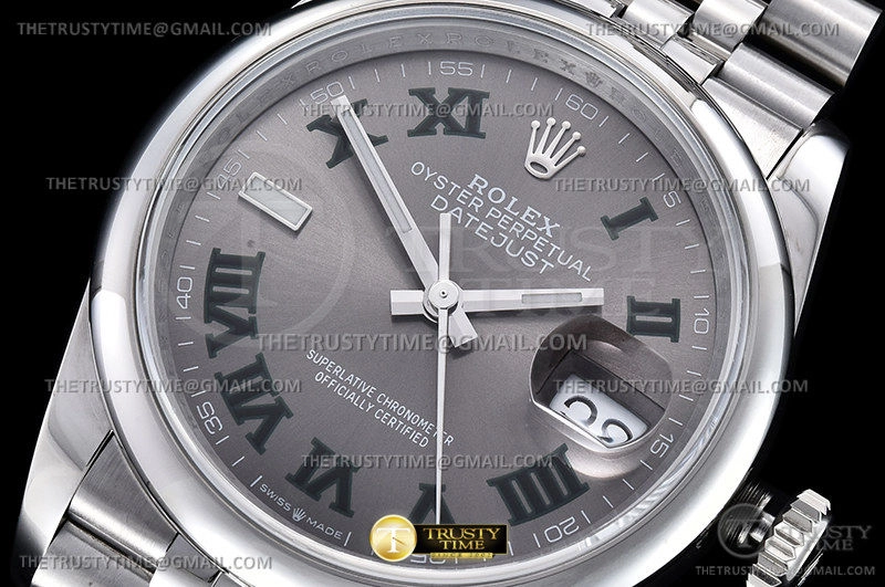 Часы Rolex из коллекции DateJust. Классические женские часы Rolex DateJust 36mm 126200-0017 премиального качества (Артикул магазина: RX-2081) оснащены надежным автоматическим механизмом с автоподзаводом (работает от амплитуды движения руки) калибра 3235, в котором реализованы следующие функции: часовая, минутная и секундная стрелки, а так же дата. Круглый корпус часов стального цвета, имеющий размер 36 мм и высоту 12 мм превосходно дополнит образ и украсит запястье своего обладателя. Для изготовления часов Rolex DateJust 36mm 126200-0017 предлагаемых в нашем интернет-магазине, применяются нержавеющая сталь 904L высокого качества (Швейцарский стандарт), а так же сапфировое стекло высокой прочности, благодаря чему обеспечивается максимальная защита от сколов и механических повреждений. Отличительной чертой данной модели является серый циферблат, часовые индексы которого обеспечивают римские цифры. Завершает образ браслет из нержавеющей стали стального цвета с фирменной раскладывающейся застежкой Rolex. Водонепроницаемость данной модели составляет 30М (WR30) – допускается минимальное воздействие с водой.