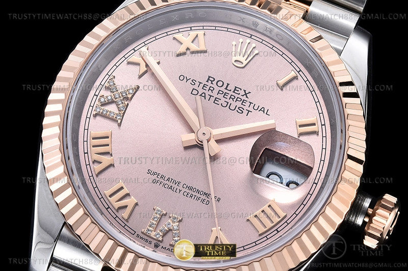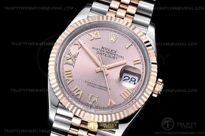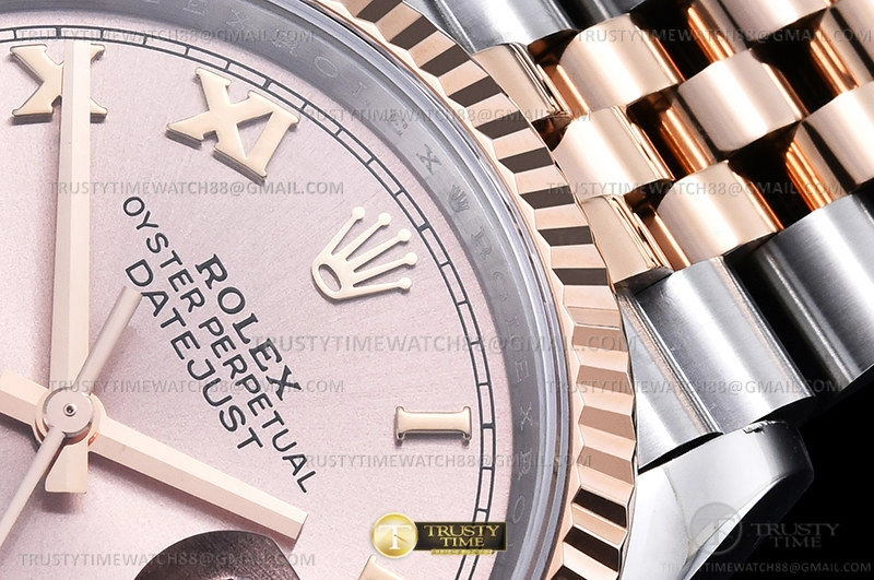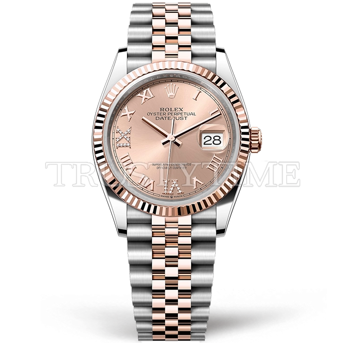 Часы Rolex из коллекции DateJust. Классические женские часы Rolex DateJust 36mm 126231-0027 премиального качества (Артикул магазина: RX-2270) оснащены надежным автоматическим механизмом с автоподзаводом (работает от амплитуды движения руки) калибра 3235, в котором реализованы следующие функции: часовая, минутная и секундная стрелки, а так же дата. Круглый корпус часов комбинированного сталь с розового золота цвета, имеющий размер 36 мм и высоту 12 мм превосходно дополнит образ и украсит запястье своего обладателя. Для изготовления часов Rolex DateJust 36mm 126231-0027 предлагаемых в нашем интернет-магазине, применяются нержавеющая сталь 904L высокого качества (Швейцарский стандарт), а так же сапфировое стекло высокой прочности, благодаря чему обеспечивается максимальная защита от сколов и механических повреждений. Отличительной чертой данной модели является золотой циферблат, часовые индексы которого обеспечивают римские цифры. Завершает образ браслет из нержавеющей стали комбинированного сталь с розовым золотом цвета с фирменной раскладывающейся застежкой Rolex. Водонепроницаемость данной модели составляет 30М (WR30) – допускается минимальное воздействие с водой.