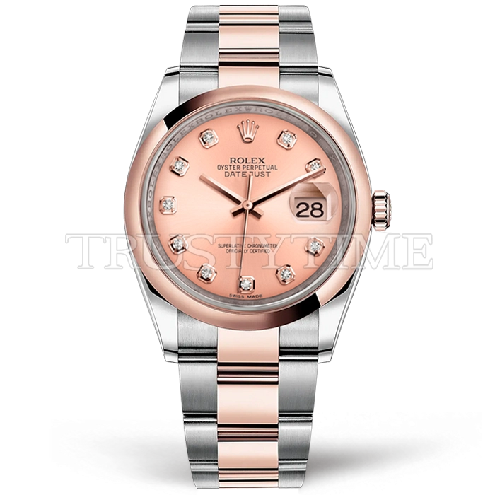 Часы Rolex из коллекции DateJust. Классические женские часы Rolex DateJust 36mm 116201-0081 премиального качества (Артикул магазина: RX-2451) оснащены надежным автоматическим механизмом с автоподзаводом (работает от амплитуды движения руки) калибра 3135, в котором реализованы следующие функции: часовая, минутная и секундная стрелки, а так же дата. Круглый корпус часов комбинированного сталь с розового золота цвета, имеющий размер 36 мм и высоту 12 мм превосходно дополнит образ и украсит запястье своего обладателя. Для изготовления часов Rolex DateJust 36mm 116201-0081 предлагаемых в нашем интернет-магазине, применяются нержавеющая сталь 316F высокого качества (Швейцарский стандарт), а так же сапфировое стекло высокой прочности, благодаря чему обеспечивается максимальная защита от сколов и механических повреждений. Отличительной чертой данной модели является золотой циферблат, часовые индексы которого обеспечивают камни. Завершает образ браслет из нержавеющей стали комбинированного сталь с розовым золотом цвета с фирменной раскладывающейся застежкой Rolex. Водонепроницаемость данной модели составляет 30М (WR30) – допускается минимальное воздействие с водой.
