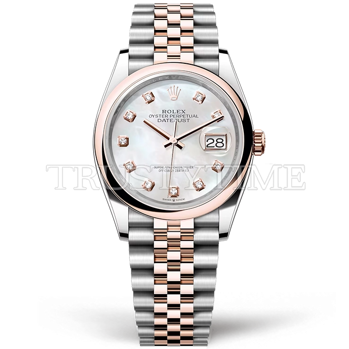 Часы Rolex из коллекции DateJust. Классические женские часы Rolex DateJust 36mm 126201-0021 премиального качества (Артикул магазина: RX-2487) оснащены надежным автоматическим механизмом с автоподзаводом (работает от амплитуды движения руки) калибра 3135, в котором реализованы следующие функции: часовая, минутная и секундная стрелки, а так же дата. Круглый корпус часов комбинированного сталь с розового золота цвета, имеющий размер 36 мм и высоту 12 мм превосходно дополнит образ и украсит запястье своего обладателя. Для изготовления часов Rolex DateJust 36mm 126201-0021 предлагаемых в нашем интернет-магазине, применяются нержавеющая сталь 316F высокого качества (Швейцарский стандарт), а так же сапфировое стекло высокой прочности, благодаря чему обеспечивается максимальная защита от сколов и механических повреждений. Отличительной чертой данной модели является перламутровый циферблат, часовые индексы которого обеспечивают камни. Завершает образ браслет из нержавеющей стали комбинированного сталь с розовым золотом цвета с фирменной раскладывающейся застежкой Rolex. Водонепроницаемость данной модели составляет 30М (WR30) – допускается минимальное воздействие с водой.