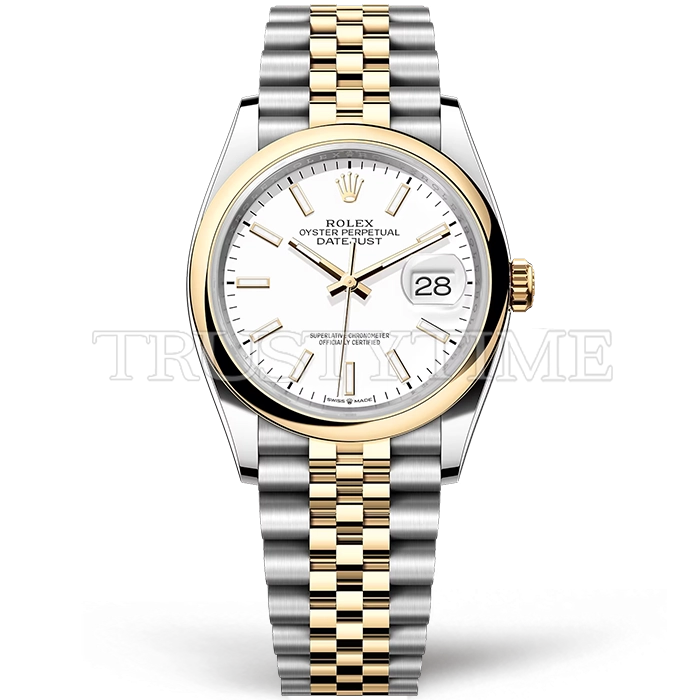 Часы Rolex из коллекции DateJust. Классические женские часы Rolex DateJust 36mm 126203-0019 премиального качества (Артикул магазина: RX-2503) оснащены надежным автоматическим механизмом с автоподзаводом (работает от амплитуды движения руки) калибра 3235, в котором реализованы следующие функции: часовая, минутная и секундная стрелки, а так же дата. Круглый корпус часов комбинированного сталь с желтого золота цвета, имеющий размер 36 мм и высоту 12 мм превосходно дополнит образ и украсит запястье своего обладателя. Для изготовления часов Rolex DateJust 36mm 126203-0019 предлагаемых в нашем интернет-магазине, применяются нержавеющая сталь 904L высокого качества (Швейцарский стандарт), а так же сапфировое стекло высокой прочности, благодаря чему обеспечивается максимальная защита от сколов и механических повреждений. Отличительной чертой данной модели является белый циферблат, часовые индексы которого обеспечивают часовые метки. Завершает образ браслет из нержавеющей стали комбинированного сталь с желтым золотом цвета с фирменной раскладывающейся застежкой Rolex. Водонепроницаемость данной модели составляет 30М (WR30) – допускается минимальное воздействие с водой.