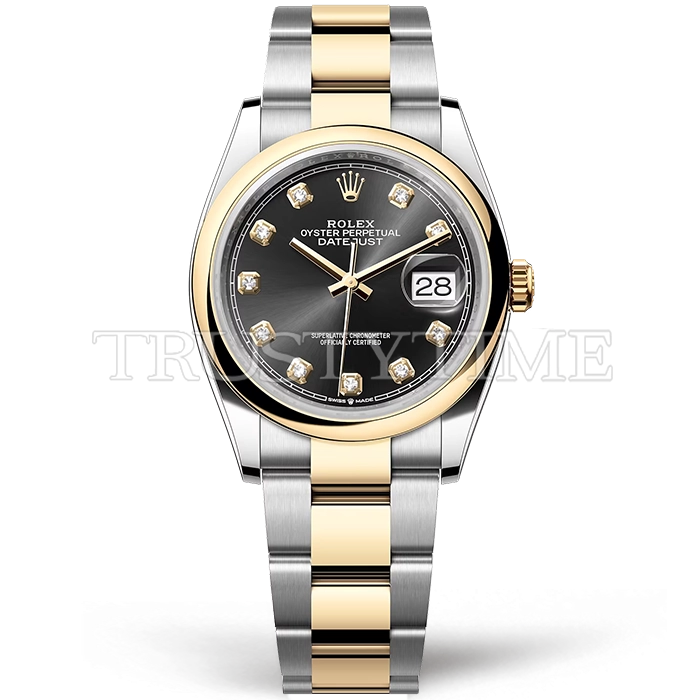 Часы Rolex из коллекции DateJust. Классические женские часы Rolex DateJust 36mm 126203-0022 премиального качества (Артикул магазина: RX-2506) оснащены надежным автоматическим механизмом с автоподзаводом (работает от амплитуды движения руки) калибра 3235, в котором реализованы следующие функции: часовая, минутная и секундная стрелки, а так же дата. Круглый корпус часов комбинированного сталь с желтого золота цвета, имеющий размер 36 мм и высоту 12 мм превосходно дополнит образ и украсит запястье своего обладателя. Для изготовления часов Rolex DateJust 36mm 126203-0022 предлагаемых в нашем интернет-магазине, применяются нержавеющая сталь 316F высокого качества (Швейцарский стандарт), а так же сапфировое стекло высокой прочности, благодаря чему обеспечивается максимальная защита от сколов и механических повреждений. Отличительной чертой данной модели является черный циферблат, часовые индексы которого обеспечивают камни. Завершает образ браслет из нержавеющей стали комбинированного сталь с желтым золотом цвета с фирменной раскладывающейся застежкой Rolex. Водонепроницаемость данной модели составляет 30М (WR30) – допускается минимальное воздействие с водой.