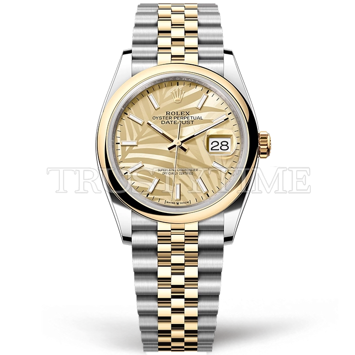 Часы Rolex из коллекции DateJust. Классические женские часы Rolex DateJust 36mm 126203-0037 премиального качества (Артикул магазина: RX-2516) оснащены надежным автоматическим механизмом с автоподзаводом (работает от амплитуды движения руки) калибра 3235, в котором реализованы следующие функции: часовая, минутная и секундная стрелки, а так же дата. Круглый корпус часов комбинированного сталь с желтого золота цвета, имеющий размер 36 мм и высоту 12 мм превосходно дополнит образ и украсит запястье своего обладателя. Для изготовления часов Rolex DateJust 36mm 126203-0037 предлагаемых в нашем интернет-магазине, применяются нержавеющая сталь 316L высокого качества (Швейцарский стандарт), а так же сапфировое стекло высокой прочности, благодаря чему обеспечивается максимальная защита от сколов и механических повреждений. Отличительной чертой данной модели является золотой циферблат, часовые индексы которого обеспечивают часовые метки. Завершает образ браслет из нержавеющей стали комбинированного сталь с желтым золотом цвета с фирменной раскладывающейся застежкой Rolex. Водонепроницаемость данной модели составляет 30М (WR30) – допускается минимальное воздействие с водой.