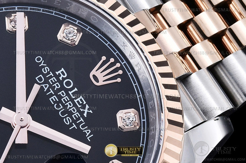 Часы Rolex из коллекции DateJust. Классические женские часы Rolex DateJust 36mm 126231-0019 премиального качества (Артикул магазина: RX-2523) оснащены надежным автоматическим механизмом с автоподзаводом (работает от амплитуды движения руки) калибра 3235, в котором реализованы следующие функции: часовая, минутная и секундная стрелки, а так же дата. Круглый корпус часов комбинированного сталь с розового золота цвета, имеющий размер 36 мм и высоту 12 мм превосходно дополнит образ и украсит запястье своего обладателя. Для изготовления часов Rolex DateJust 36mm 126231-0019 предлагаемых в нашем интернет-магазине, применяются нержавеющая сталь 316F высокого качества (Швейцарский стандарт), а так же сапфировое стекло высокой прочности, благодаря чему обеспечивается максимальная защита от сколов и механических повреждений. Отличительной чертой данной модели является черный циферблат, часовые индексы которого обеспечивают камни. Завершает образ браслет из нержавеющей стали комбинированного сталь с розовым золотом цвета с фирменной раскладывающейся застежкой Rolex. Водонепроницаемость данной модели составляет 30М (WR30) – допускается минимальное воздействие с водой.
