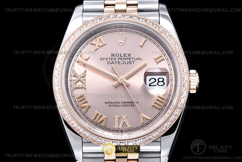 Часы Rolex из коллекции DateJust. Классические женские часы Rolex DateJust 36mm 126281RBR-0015 премиального качества (Артикул магазина: RX-2577) оснащены надежным автоматическим механизмом с автоподзаводом (работает от амплитуды движения руки) калибра 3235, в котором реализованы следующие функции: часовая, минутная и секундная стрелки, а так же дата. Круглый корпус часов комбинированного сталь с розового золота цвета, имеющий размер 36 мм и высоту 12 мм превосходно дополнит образ и украсит запястье своего обладателя. Для изготовления часов Rolex DateJust 36mm 126281RBR-0015 предлагаемых в нашем интернет-магазине, применяются нержавеющая сталь 904L высокого качества (Швейцарский стандарт), а так же сапфировое стекло высокой прочности, благодаря чему обеспечивается максимальная защита от сколов и механических повреждений. Отличительной чертой данной модели является золотой циферблат, часовые индексы которого обеспечивают римские цифры. Завершает образ браслет из нержавеющей стали комбинированного сталь с розовым золотом цвета с фирменной раскладывающейся застежкой Rolex. Водонепроницаемость данной модели составляет 30М (WR30) – допускается минимальное воздействие с водой.