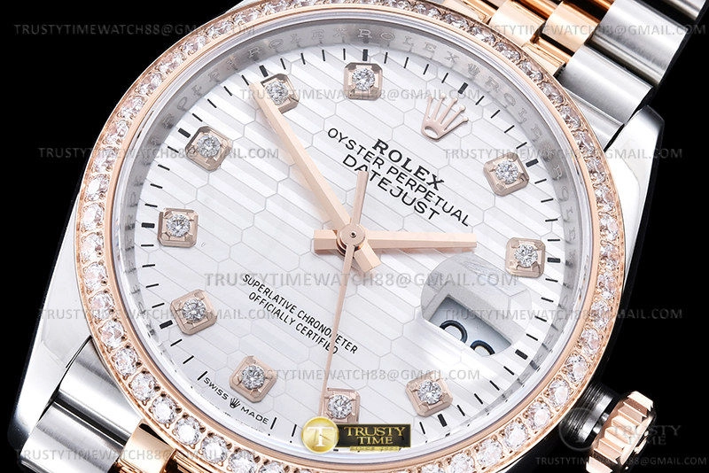 Часы Rolex из коллекции DateJust. Классические женские часы Rolex DateJust 36mm 126281RBR-0027 премиального качества (Артикул магазина: RX-2581) оснащены надежным автоматическим механизмом с автоподзаводом (работает от амплитуды движения руки) калибра 3235, в котором реализованы следующие функции: часовая, минутная и секундная стрелки, а так же дата. Круглый корпус часов комбинированного сталь с розового золота цвета, имеющий размер 36 мм и высоту 12 мм превосходно дополнит образ и украсит запястье своего обладателя. Для изготовления часов Rolex DateJust 36mm 126281RBR-0027 предлагаемых в нашем интернет-магазине, применяются нержавеющая сталь 316F высокого качества (Швейцарский стандарт), а так же сапфировое стекло высокой прочности, благодаря чему обеспечивается максимальная защита от сколов и механических повреждений. Отличительной чертой данной модели является серебристый циферблат, часовые индексы которого обеспечивают камни. Завершает образ браслет из нержавеющей стали комбинированного сталь с розовым золотом цвета с фирменной раскладывающейся застежкой Rolex. Водонепроницаемость данной модели составляет 30М (WR30) – допускается минимальное воздействие с водой.