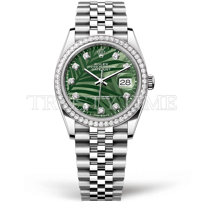 Часы Rolex из коллекции DateJust. Классические женские часы Rolex DateJust 36mm 126284RBR-0047 премиального качества (Артикул магазина: RX-2631) оснащены надежным автоматическим механизмом с автоподзаводом (работает от амплитуды движения руки) калибра 3235, в котором реализованы следующие функции: часовая, минутная и секундная стрелки, а так же дата. Круглый корпус часов стального цвета, имеющий размер 36 мм и высоту 12 мм превосходно дополнит образ и украсит запястье своего обладателя. Для изготовления часов Rolex DateJust 36mm 126284RBR-0047 предлагаемых в нашем интернет-магазине, применяются нержавеющая сталь 904L высокого качества (Швейцарский стандарт), а так же сапфировое стекло высокой прочности, благодаря чему обеспечивается максимальная защита от сколов и механических повреждений. Отличительной чертой данной модели является зеленый циферблат, часовые индексы которого обеспечивают камни. Завершает образ браслет из нержавеющей стали стального цвета с фирменной раскладывающейся застежкой Rolex. Водонепроницаемость данной модели составляет 30М (WR30) – допускается минимальное воздействие с водой.