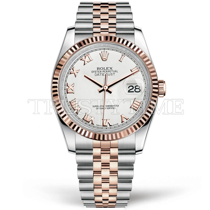 Часы Rolex из коллекции DateJust. Классические женские часы Rolex DateJust 36mm 116231-0084 премиального качества (Артикул магазина: RX-2987) оснащены надежным автоматическим механизмом с автоподзаводом (работает от амплитуды движения руки) калибра 3135, в котором реализованы следующие функции: часовая, минутная и секундная стрелки, а так же дата. Круглый корпус часов комбинированного сталь с розового золота цвета, имеющий размер 36 мм и высоту 12 мм превосходно дополнит образ и украсит запястье своего обладателя. Для изготовления часов Rolex DateJust 36mm 116231-0084 предлагаемых в нашем интернет-магазине, применяются нержавеющая сталь 316F высокого качества (Швейцарский стандарт), а так же сапфировое стекло высокой прочности, благодаря чему обеспечивается максимальная защита от сколов и механических повреждений. Отличительной чертой данной модели является белый циферблат, часовые индексы которого обеспечивают римские цифры. Завершает образ браслет из нержавеющей стали комбинированного сталь с розовым золотом цвета с фирменной раскладывающейся застежкой Rolex. Водонепроницаемость данной модели составляет 30М (WR30) – допускается минимальное воздействие с водой.