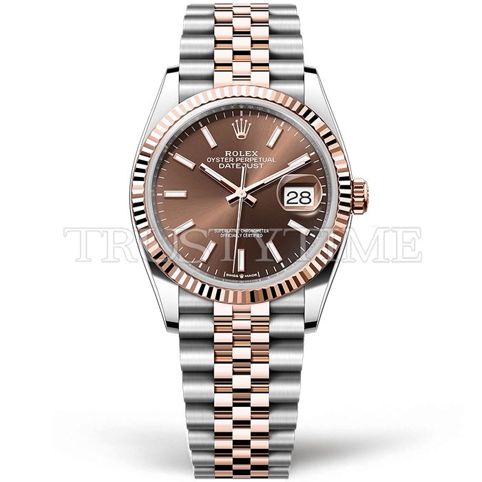 Часы Rolex из коллекции DateJust. Классические женские часы Rolex DateJust 36mm 126231-0043 премиального качества (Артикул магазина: RX-2993) оснащены надежным автоматическим механизмом с автоподзаводом (работает от амплитуды движения руки) калибра 3235, в котором реализованы следующие функции: часовая, минутная и секундная стрелки, а так же дата. Круглый корпус часов комбинированного сталь с розового золота цвета, имеющий размер 36 мм и высоту 12 мм превосходно дополнит образ и украсит запястье своего обладателя. Для изготовления часов Rolex DateJust 36mm 126231-0043 предлагаемых в нашем интернет-магазине, применяются нержавеющая сталь 904L высокого качества (Швейцарский стандарт), а так же сапфировое стекло высокой прочности, благодаря чему обеспечивается максимальная защита от сколов и механических повреждений. Отличительной чертой данной модели является коричневый циферблат, часовые индексы которого обеспечивают часовые метки. Завершает образ браслет из нержавеющей стали комбинированного сталь с розовым золотом цвета с фирменной раскладывающейся застежкой Rolex. Водонепроницаемость данной модели составляет 30М (WR30) – допускается минимальное воздействие с водой.