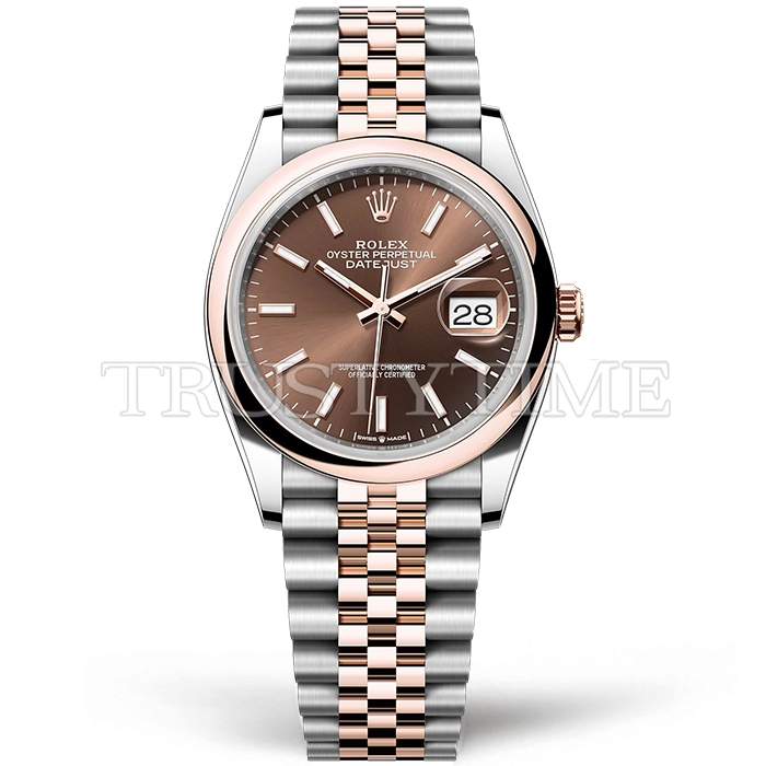 Часы Rolex из коллекции DateJust. Классические женские часы Rolex DateJust 36mm 126201-0043 премиального качества (Артикул магазина: RX-2995) оснащены надежным автоматическим механизмом с автоподзаводом (работает от амплитуды движения руки) калибра 3235, в котором реализованы следующие функции: часовая, минутная и секундная стрелки, а так же дата. Круглый корпус часов комбинированного сталь с розового золота цвета, имеющий размер 36 мм и высоту 12 мм превосходно дополнит образ и украсит запястье своего обладателя. Для изготовления часов Rolex DateJust 36mm 126201-0043 предлагаемых в нашем интернет-магазине, применяются нержавеющая сталь 904L высокого качества (Швейцарский стандарт), а так же сапфировое стекло высокой прочности, благодаря чему обеспечивается максимальная защита от сколов и механических повреждений. Отличительной чертой данной модели является коричневый циферблат, часовые индексы которого обеспечивают часовые метки. Завершает образ браслет из нержавеющей стали комбинированного сталь с розовым золотом цвета с фирменной раскладывающейся застежкой Rolex. Водонепроницаемость данной модели составляет 30М (WR30) – допускается минимальное воздействие с водой.